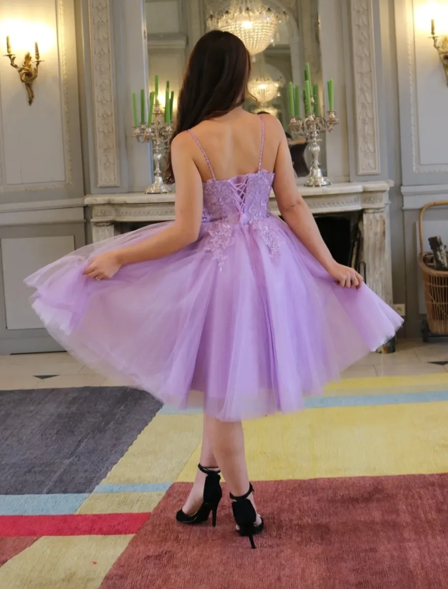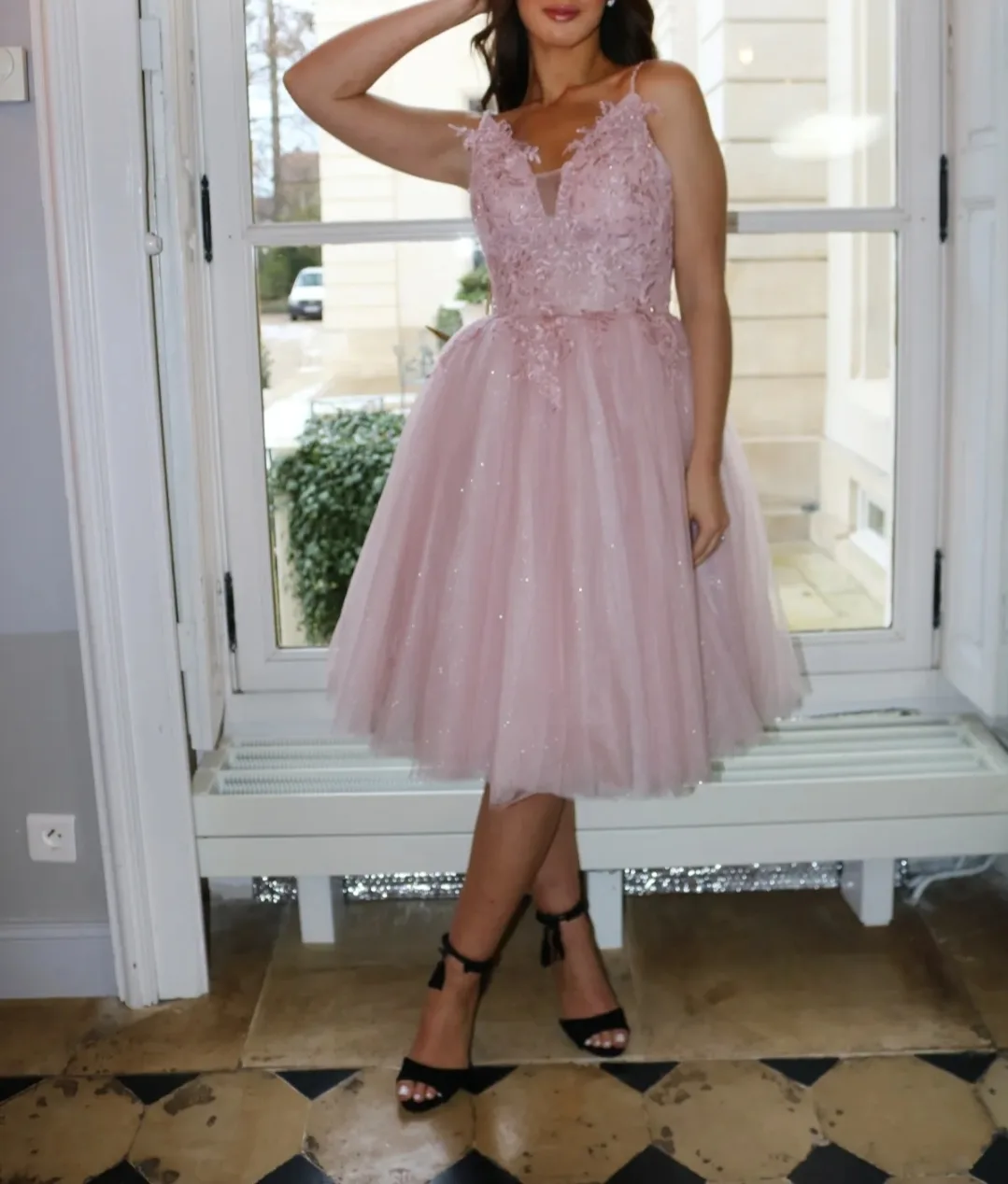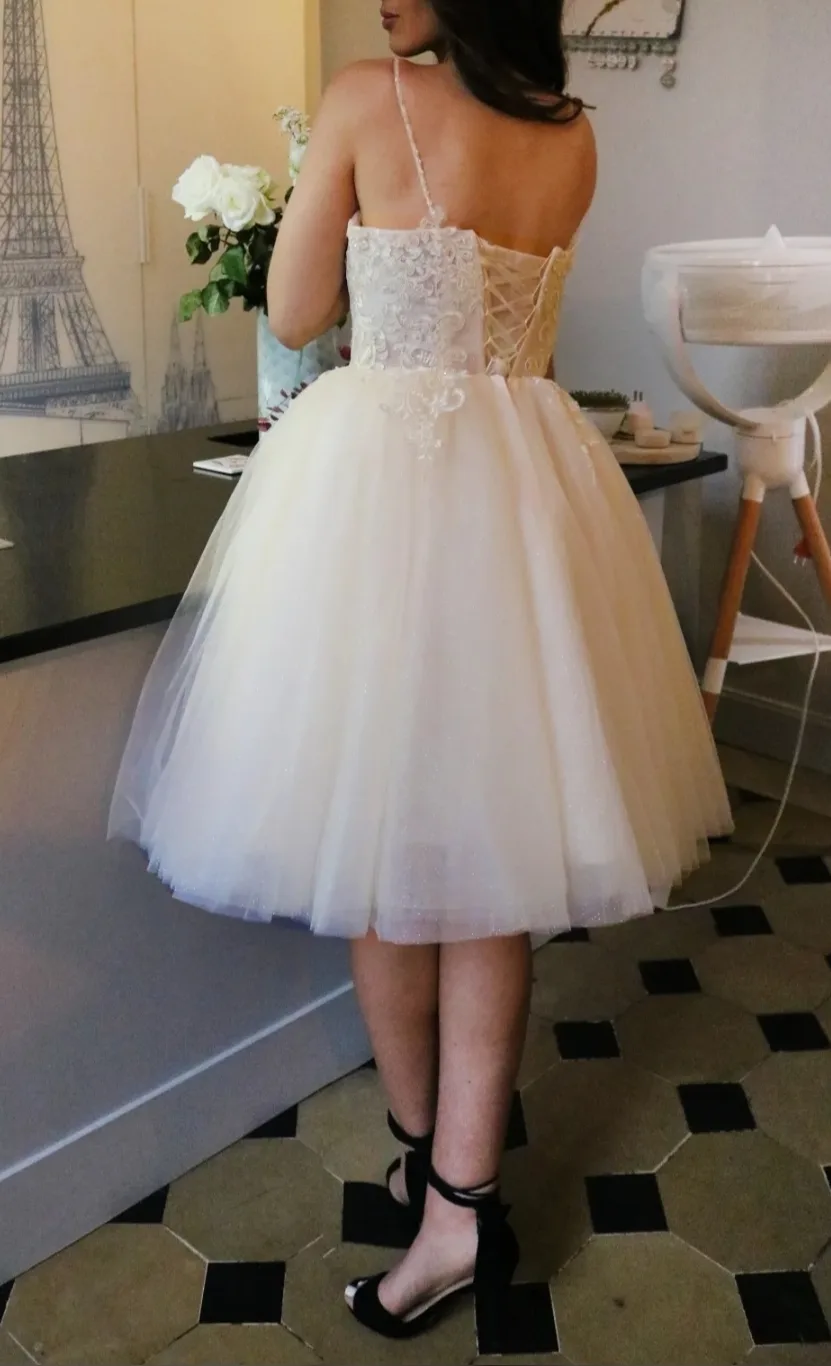 Robe de cérémonie courte style princesse en tulle et dentelle