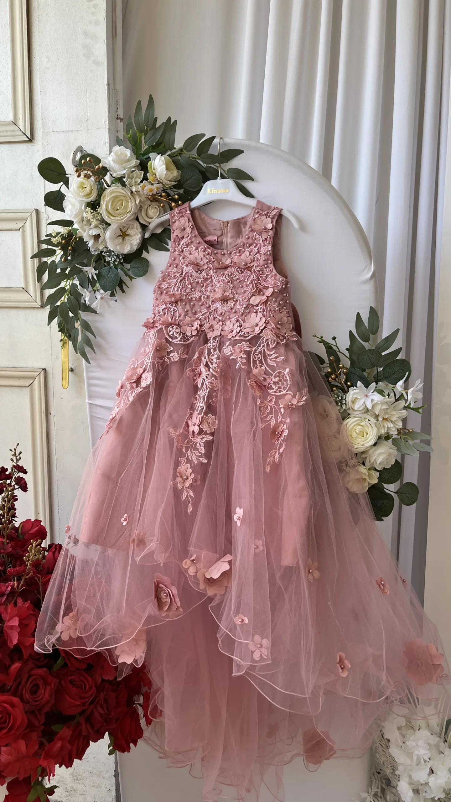 Une robe de cérémonie féerique pour petite fille, confectionnée dans un sublime tulle rose poudré et ornée de délicates broderies florales et de fleurs en relief. Son volume élégant et ses détails raffinés en font la tenue parfaite pour un mariage, un baptême ou toute occasion spéciale.