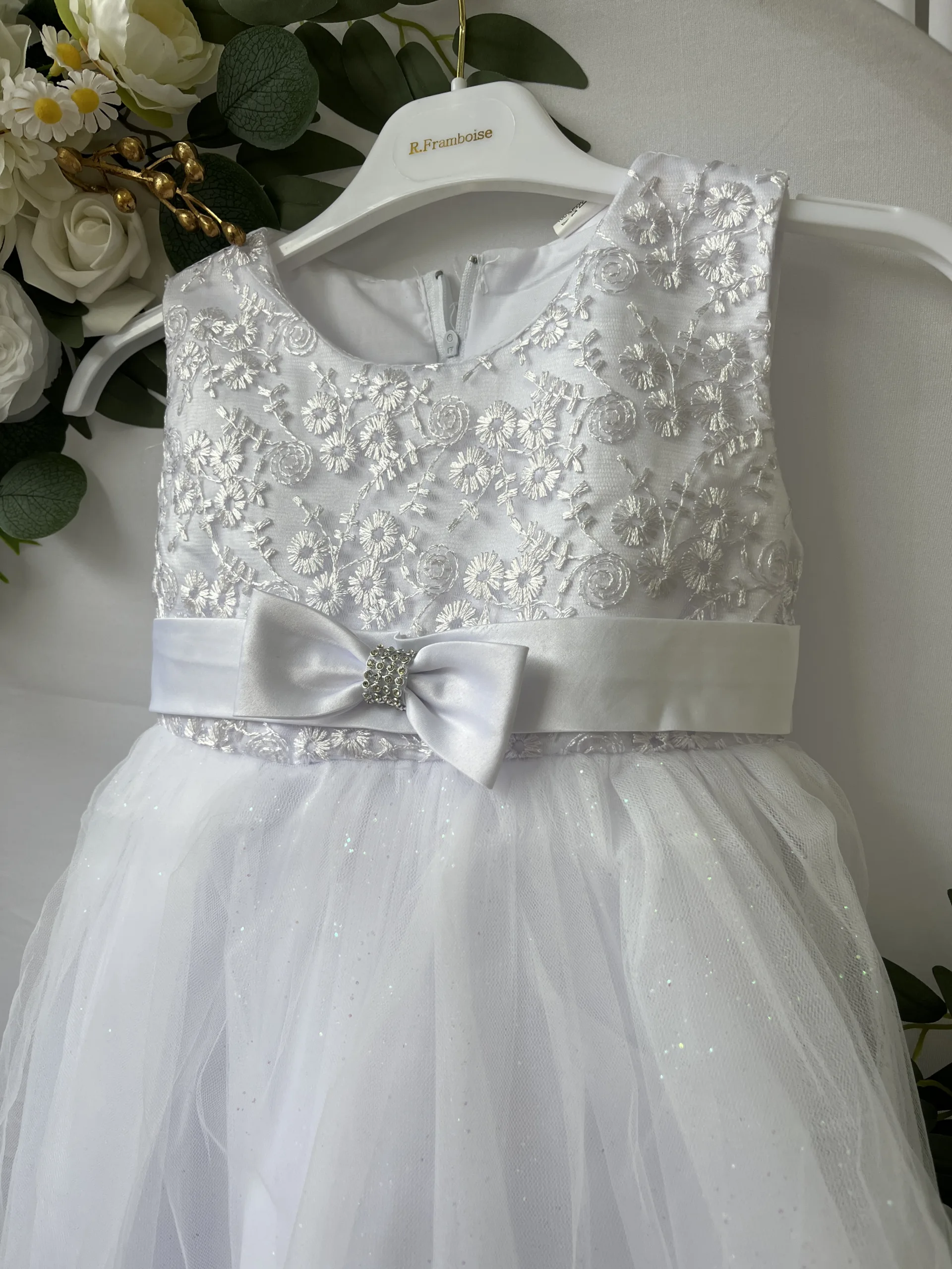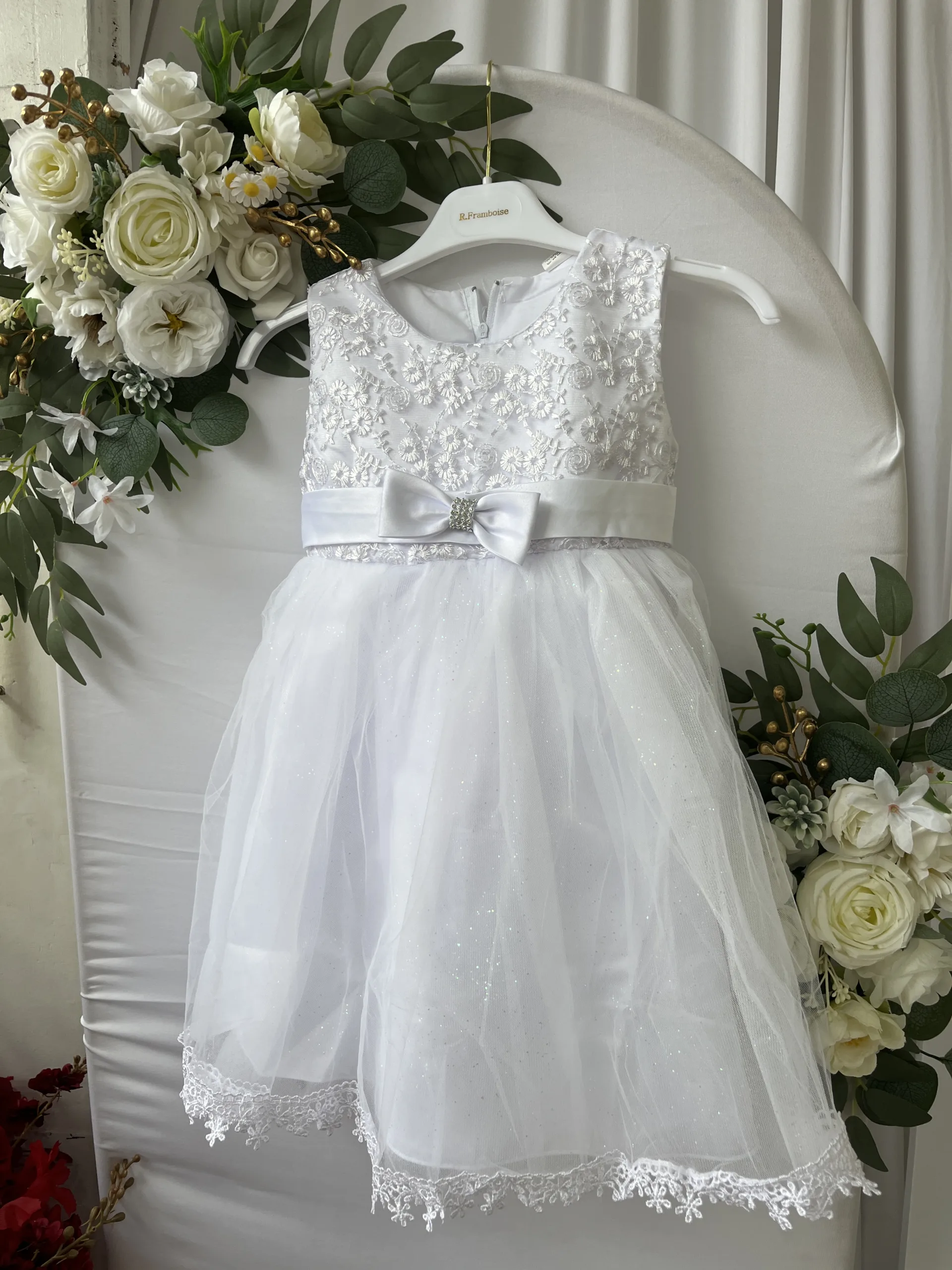 Le haut de la robe est orné de broderies florales délicates qui apportent du relief et une finition précieuse. Chaque détail est travaillé avec soin, donnant à cette pièce un aspect à la fois sophistiqué et tendre, parfaitement adapté à l’univers de la petite enfance. La transparence subtile du tulle brodé laisse apparaître une doublure douce, garantissant à la fois élégance et confort.