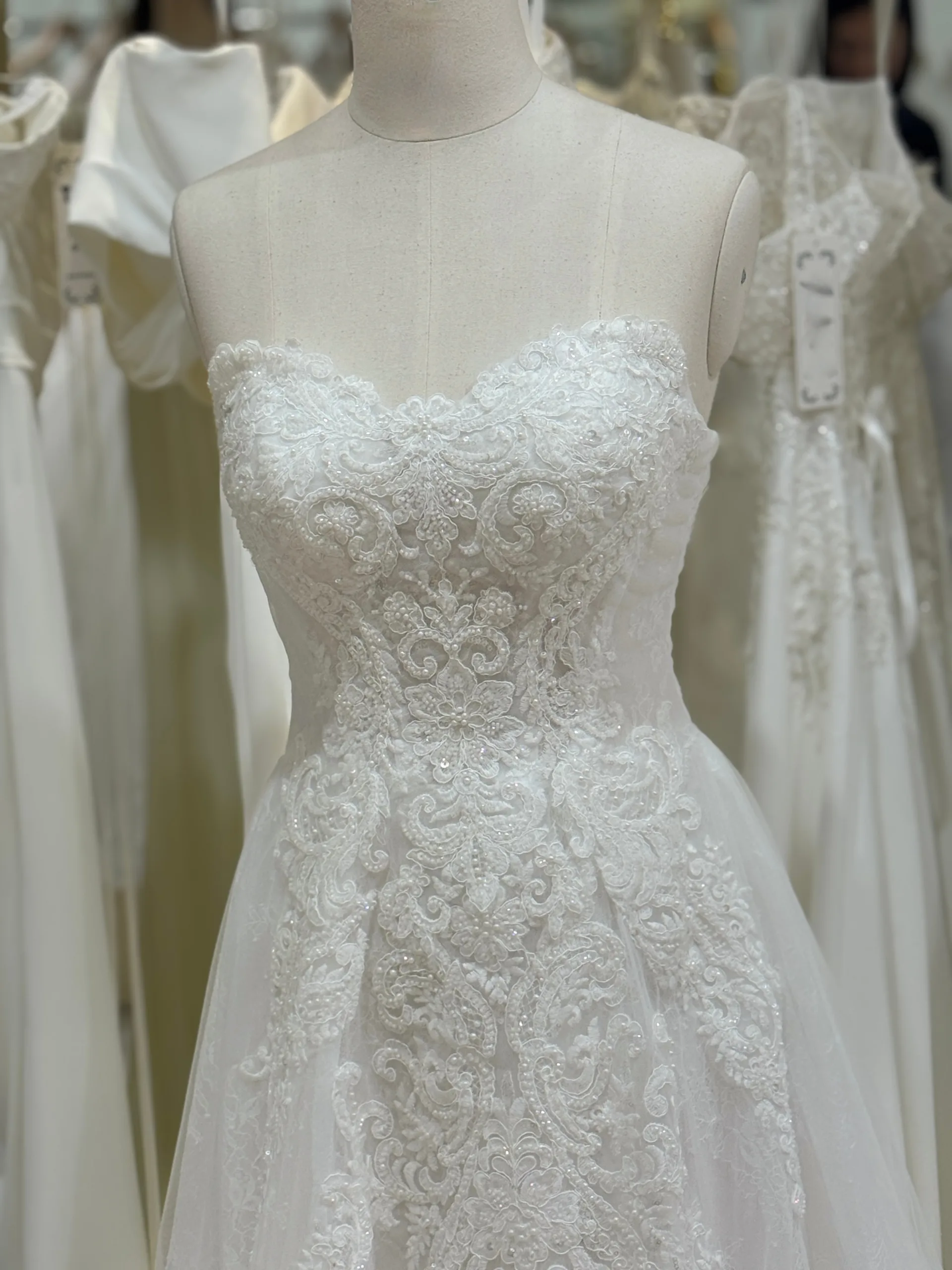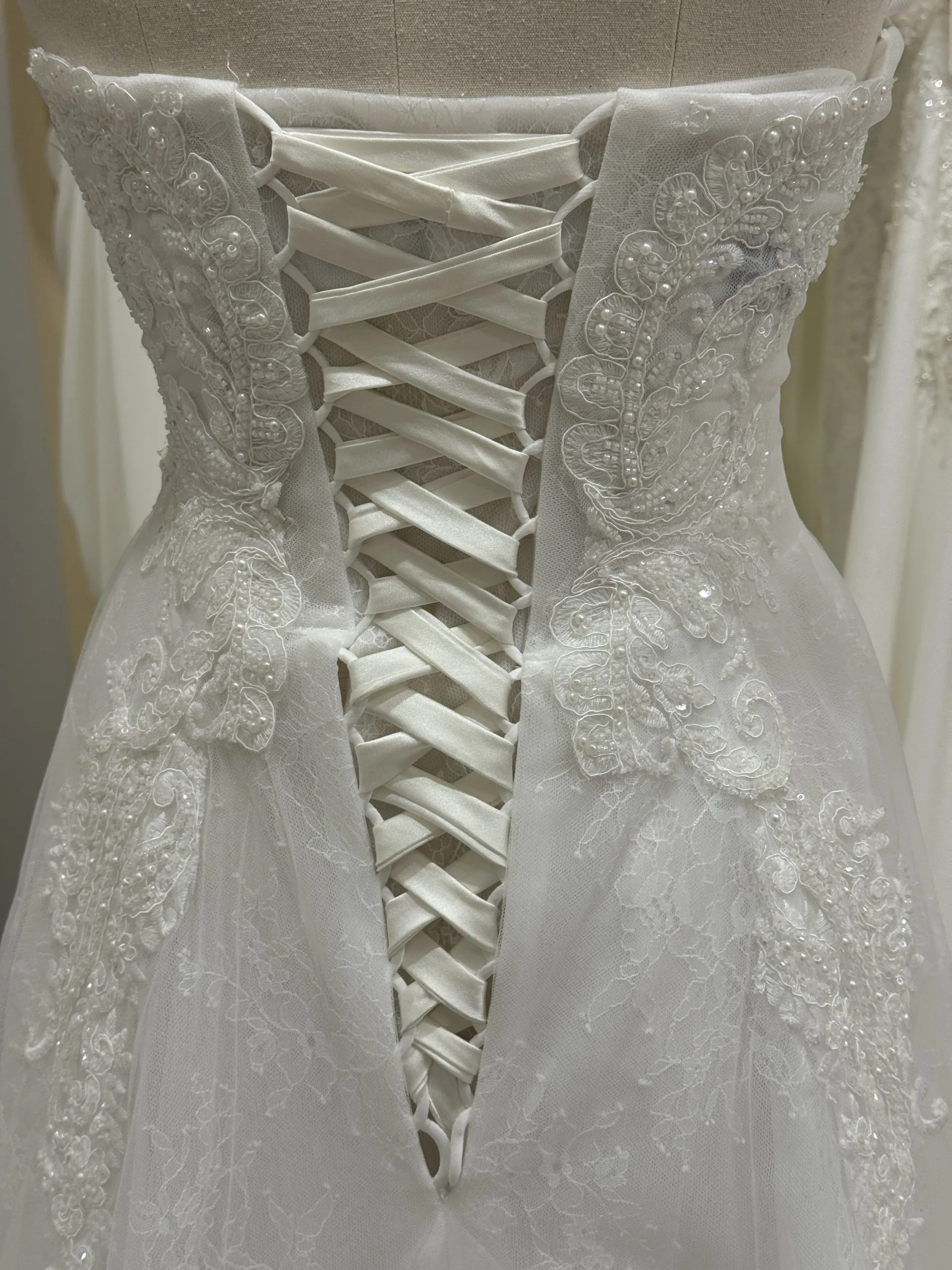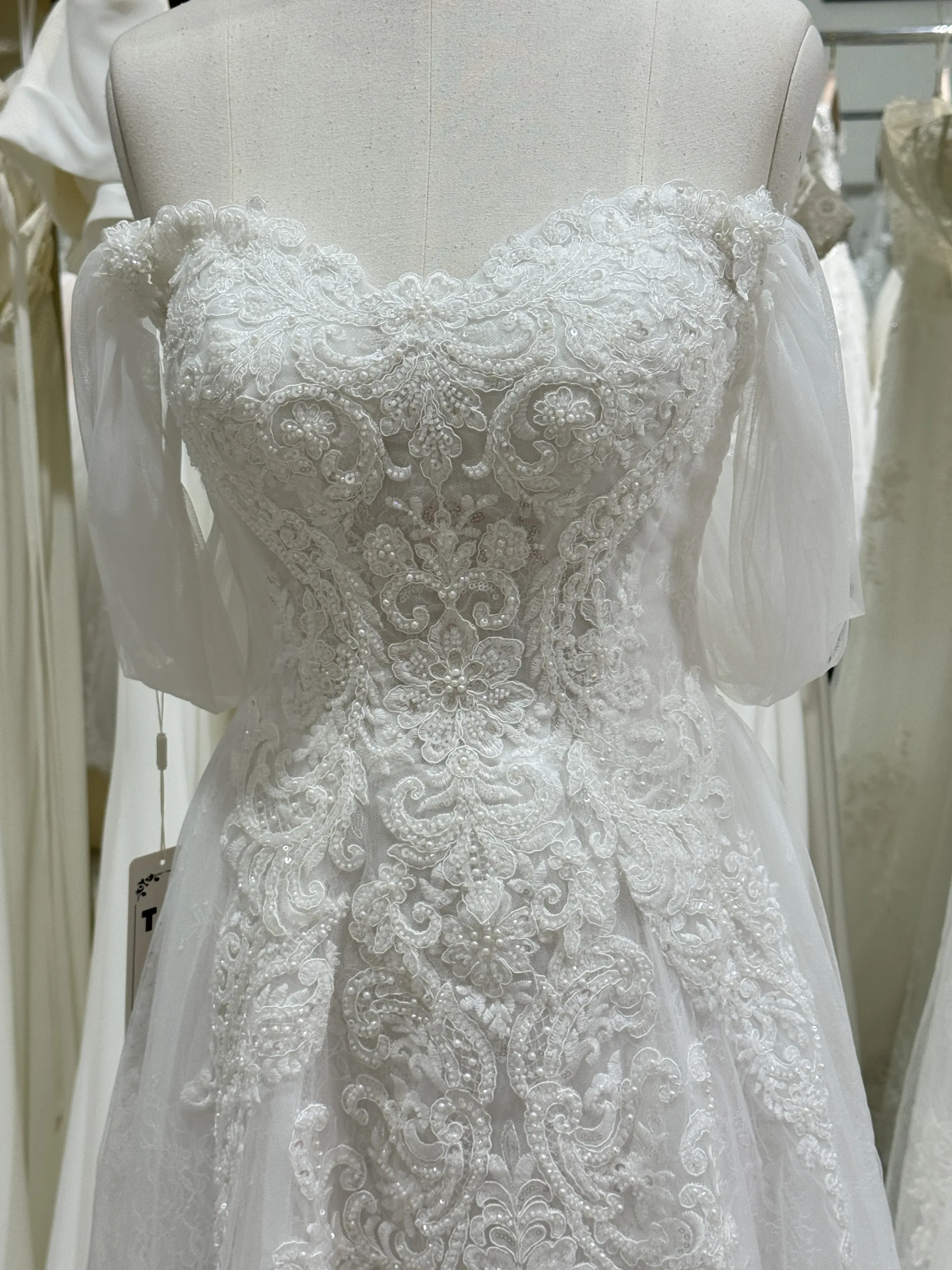 Le bustier en cœur, délicatement rehaussé de dentelle symétrique, épouse parfaitement les courbes du buste sans rigidité. Chaque motif de dentelle a été choisi pour souligner la féminité naturelle et donner une impression de finesse et de légèreté. Les épaules dégagées, mises en valeur par le décolleté subtil, créent une allure sensuelle sans être trop exposée, tandis que les manches vaporeuses, semblables à de fines ailes de tulle, apportent du mouvement et un effet presque féérique à chaque pas. Ces manches tombantes ajoutent de la fluidité et peuvent être retirées pour révéler un bustier chic et moderne, offrant à la mariée une liberté de style exceptionnelle.