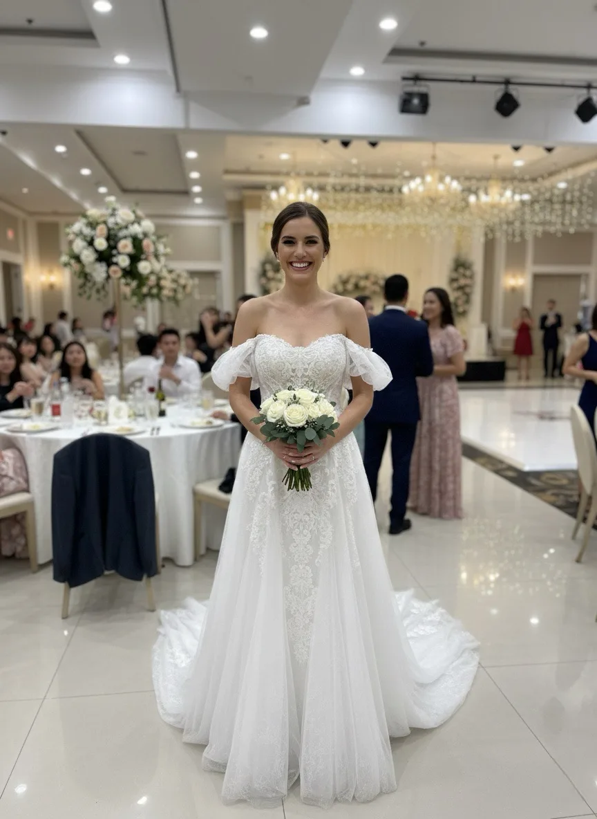 Alliant modernité et romantisme, cette robe 2-en-1 combine un bustier élégant et des manches bateau amovibles en tulle. Fluide et aérienne, elle sublime la silhouette tout en offrant liberté et confort, parfaite pour un mariage en plein air ou champêtre.