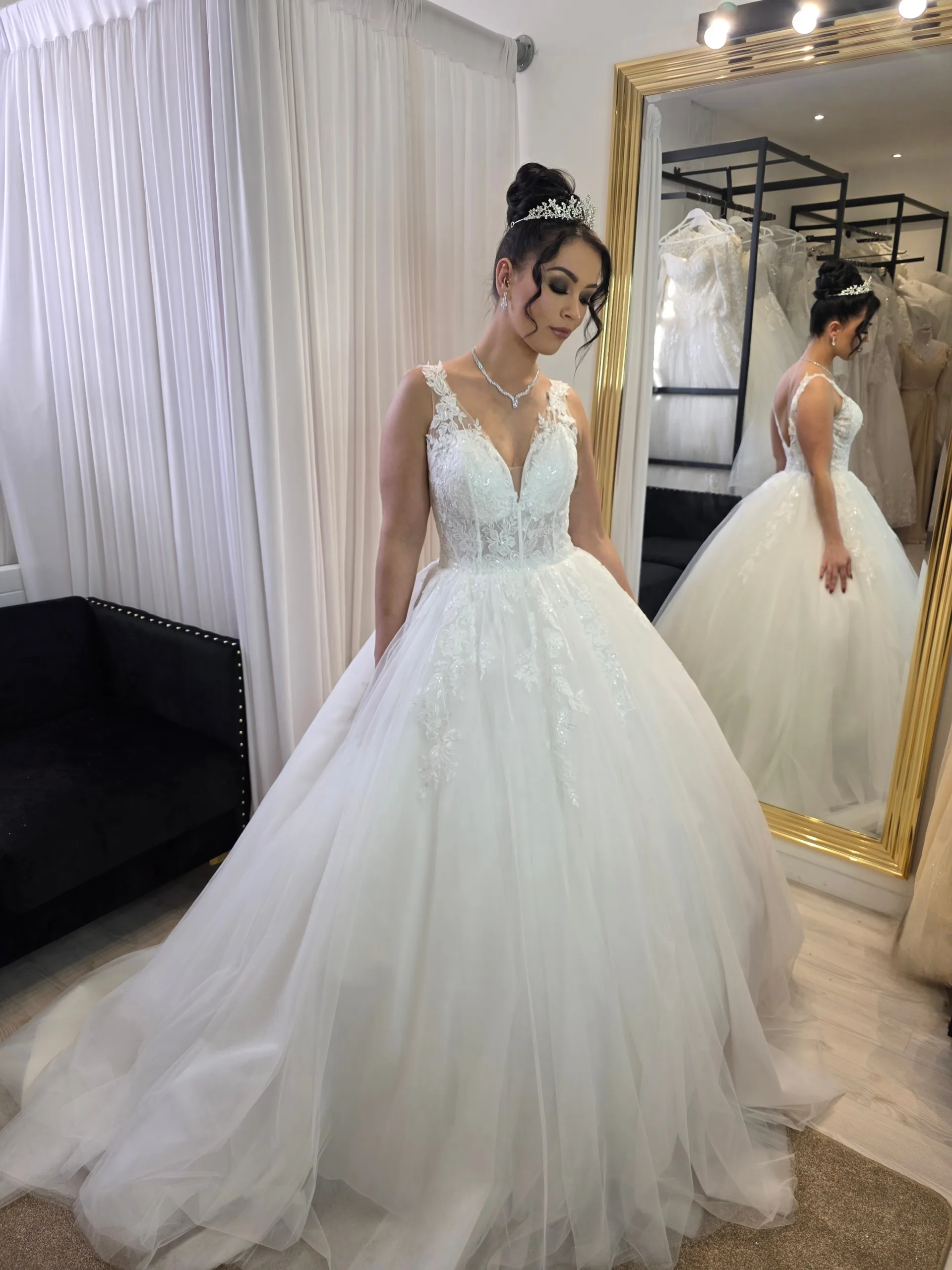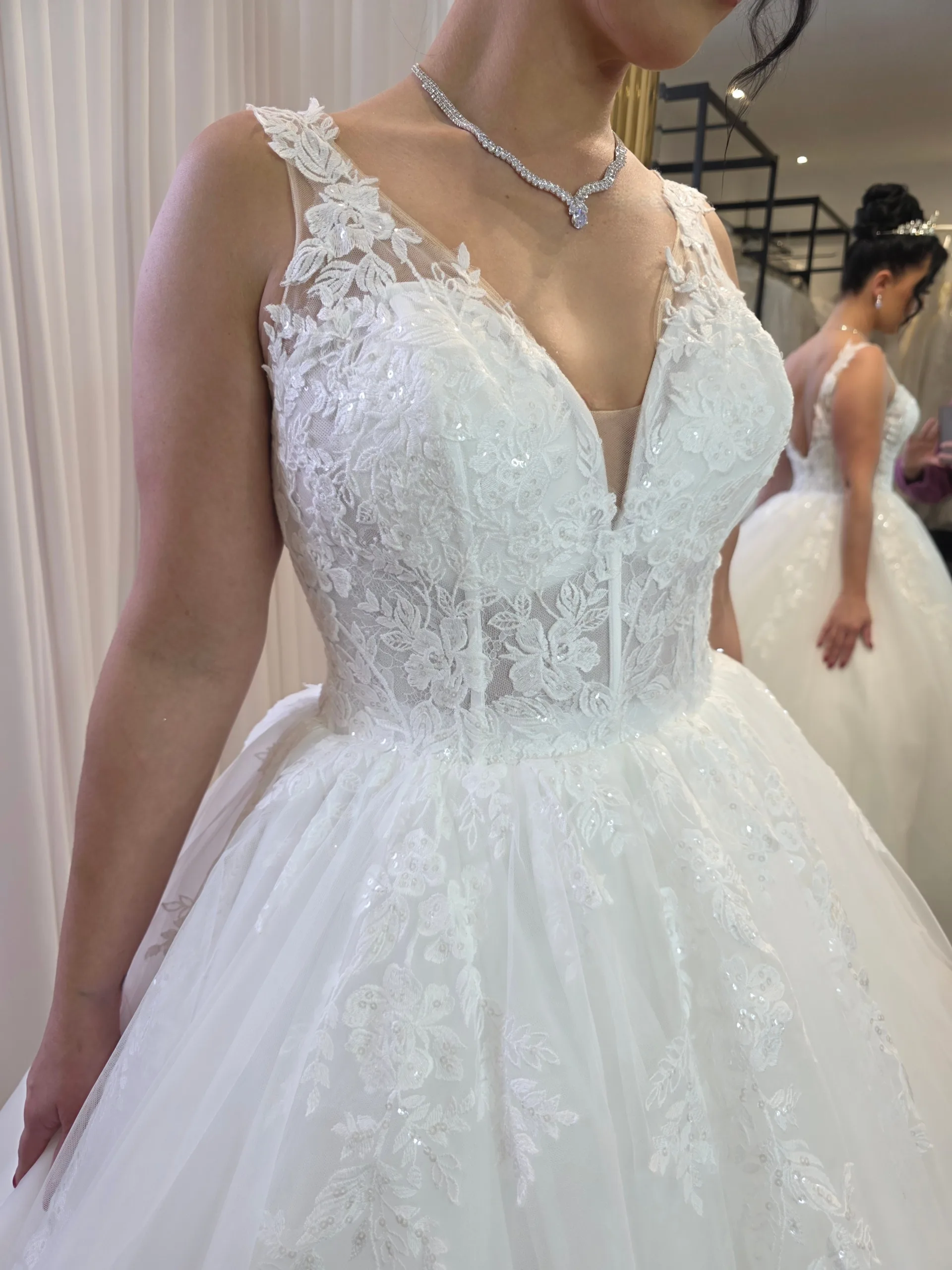 Sublime robe de mariée Fleury princesse en tulle aérien et dentelle raffinée. Son décolleté illusion et sa jupe volumineuse créent une silhouette élégante, romantique et intemporelle.