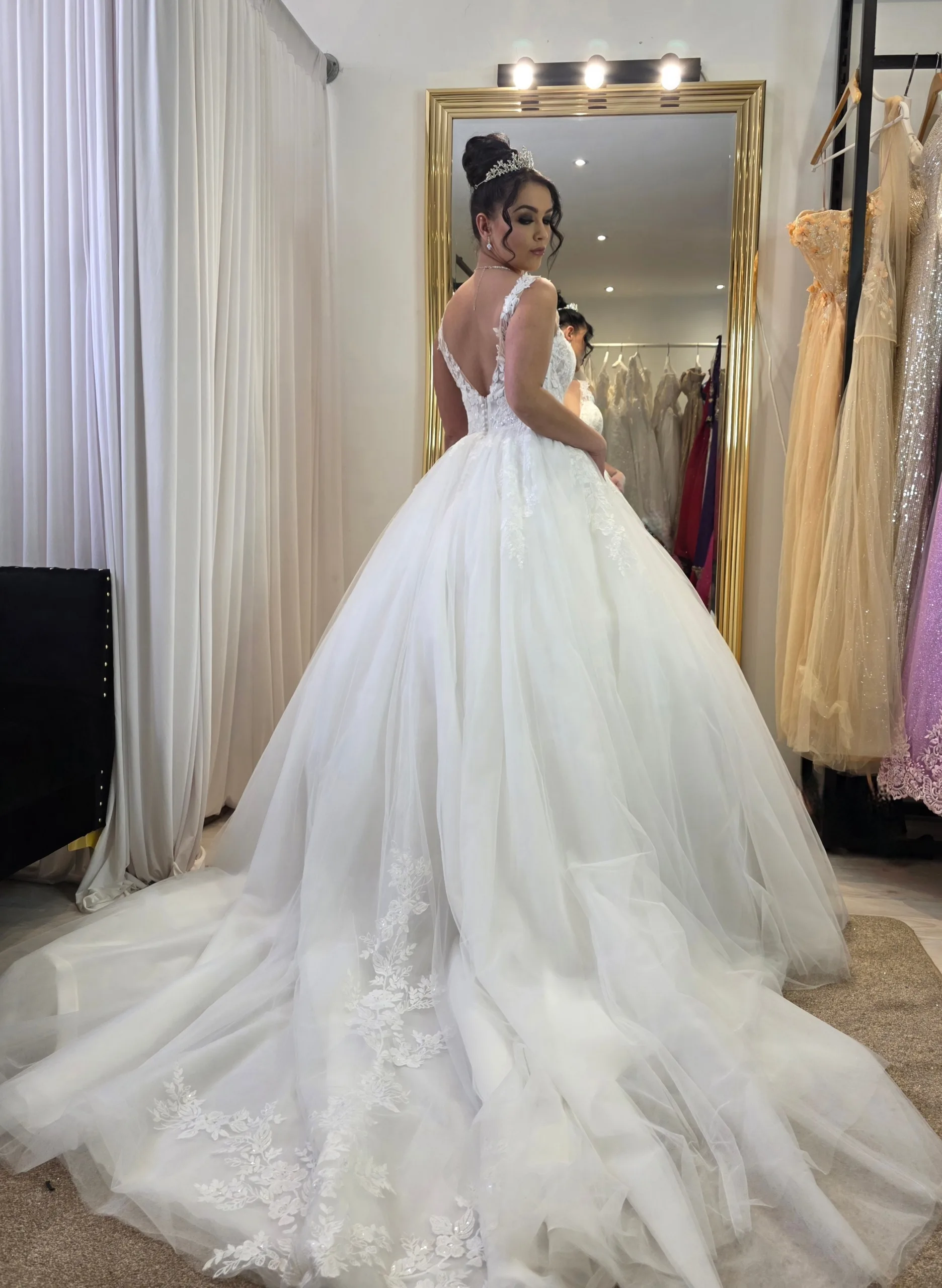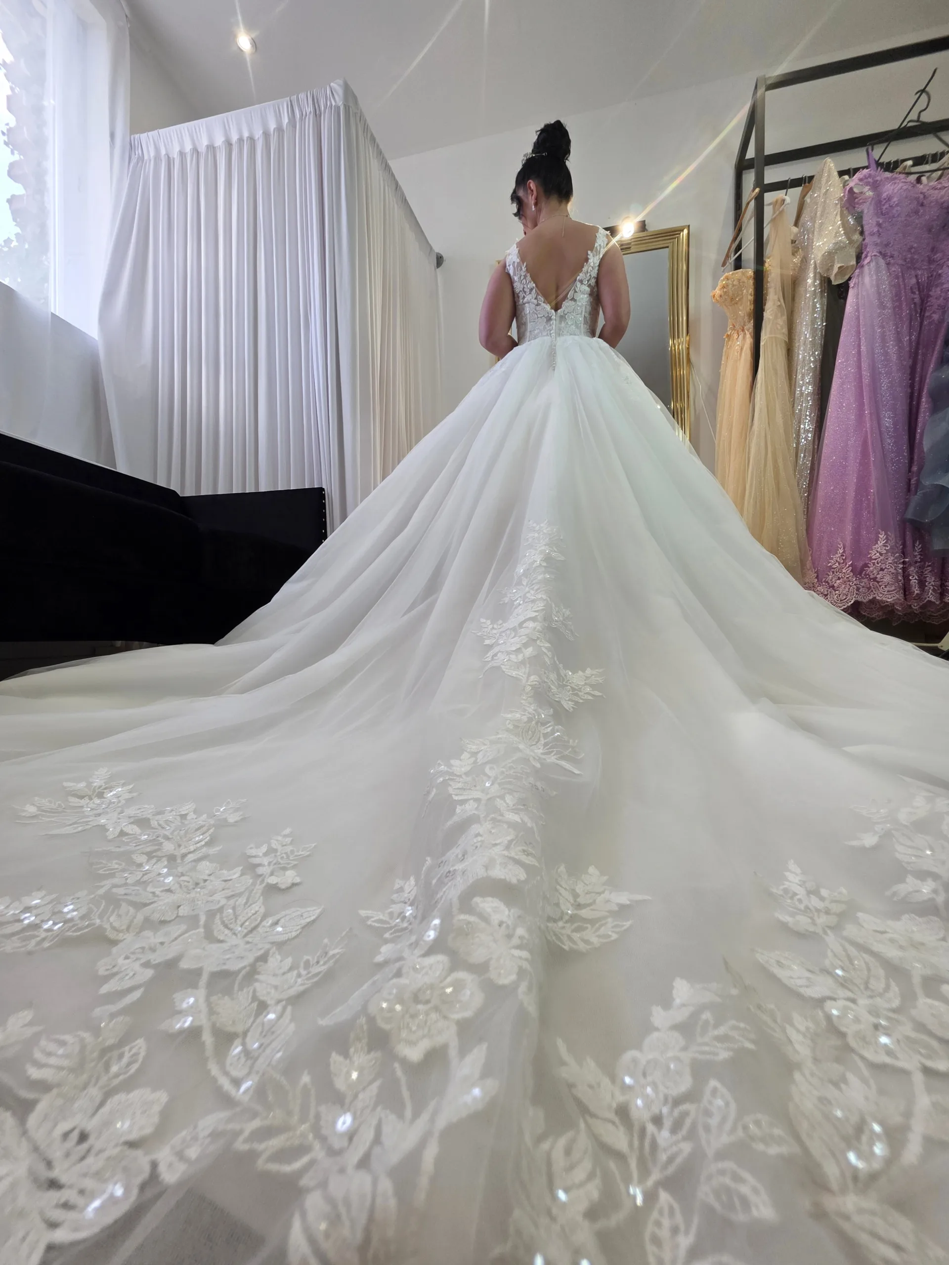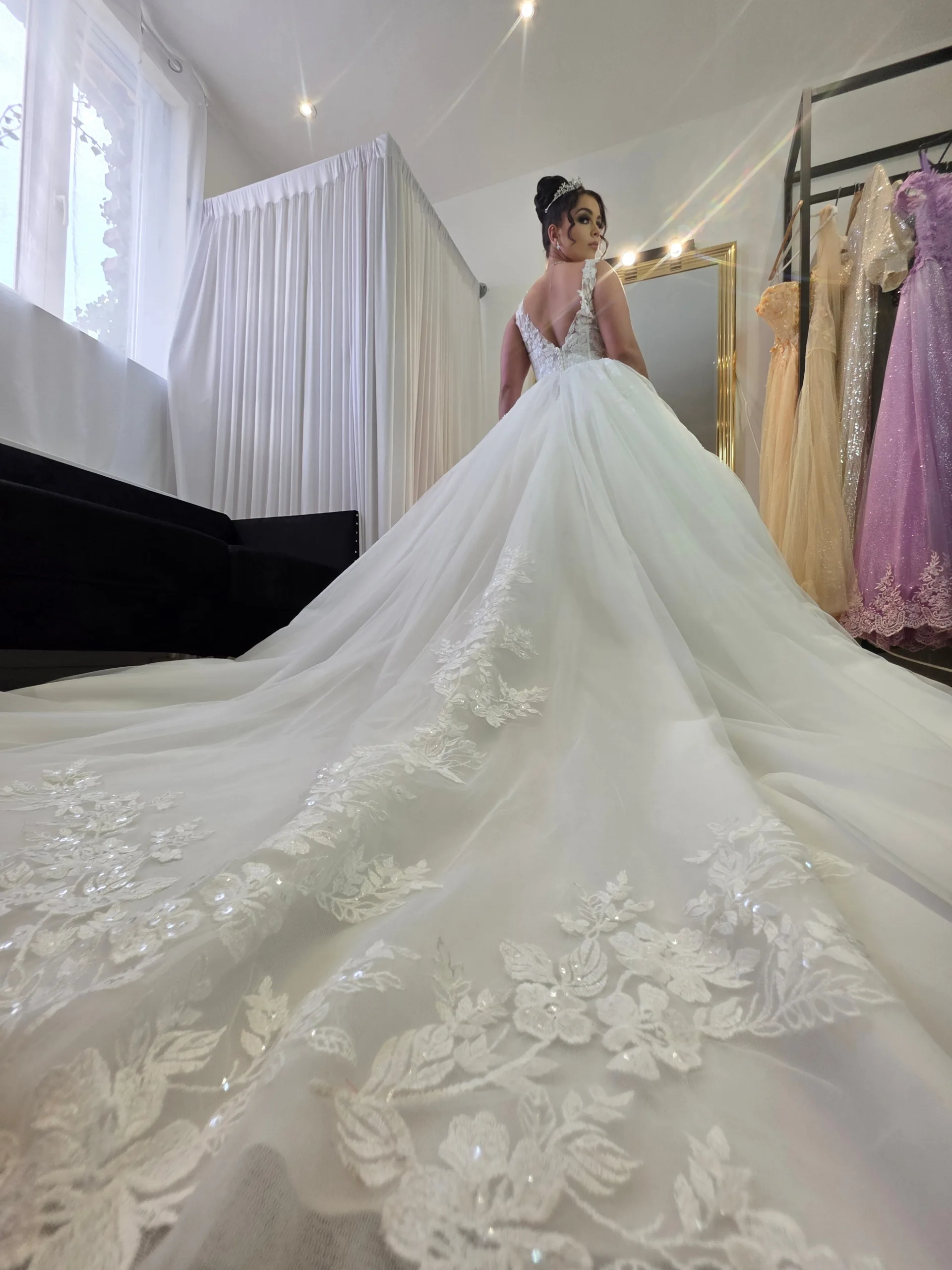 La taille est marquée avec justesse, dessinant une silhouette harmonieuse et féminine. C’est ici que la magie opère : la jupe princesse en tulle prend toute son ampleur. Fluide, légère et aérienne, elle donne une allure royale sans alourdir la silhouette. Le volume est parfaitement maîtrisé pour offrir un tombé naturel et élégant à chacun de vos pas.