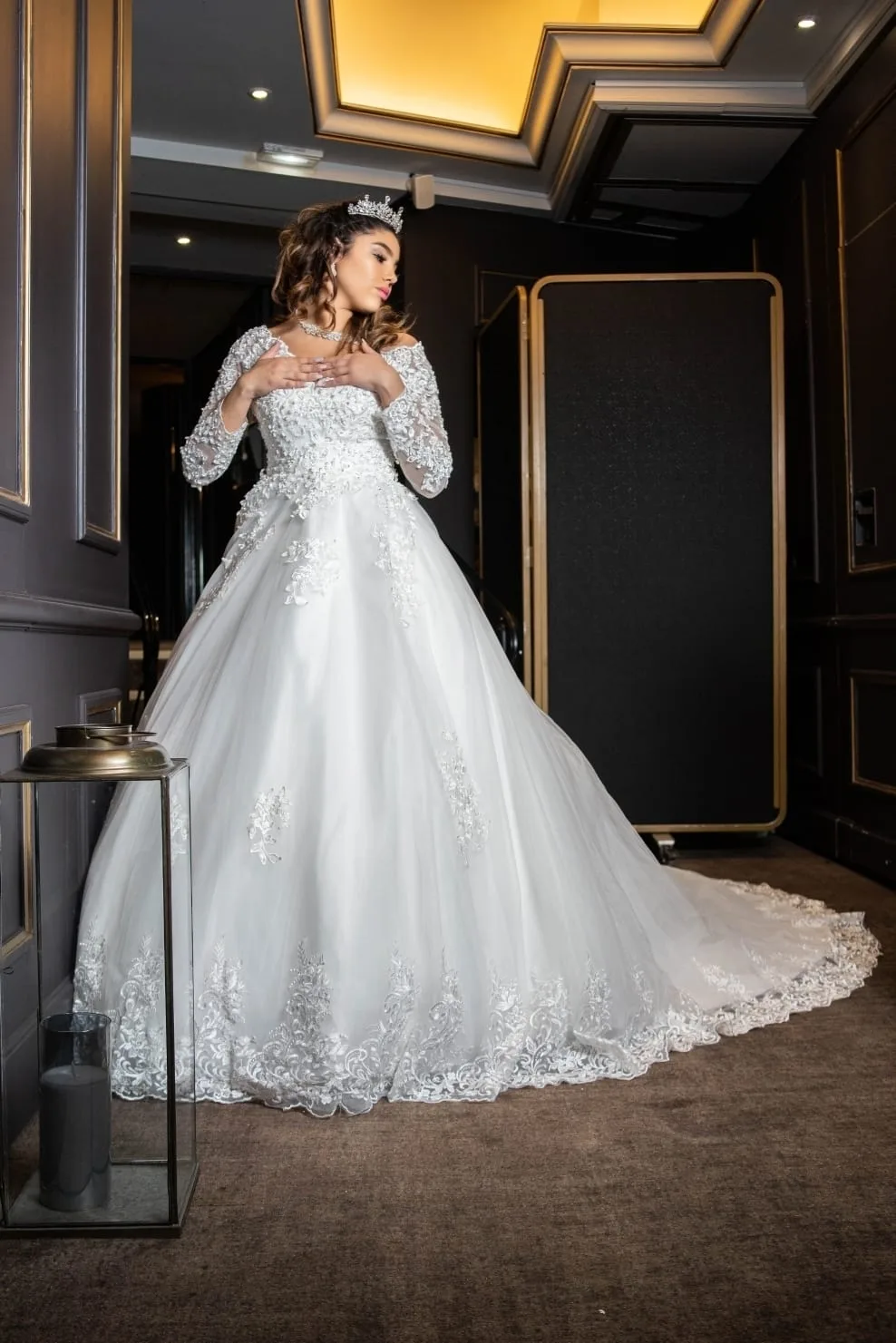 Sublimez votre union avec la robe de mariée princesse dentelle de notre collection exclusive Royaume Cristal. Véritable hymne à la féminité, ce modèle unique se distingue par son bustier en col V et ses manches longues en tulle transparent, délicatement ornés de dentelle perlée et de broderies fines.