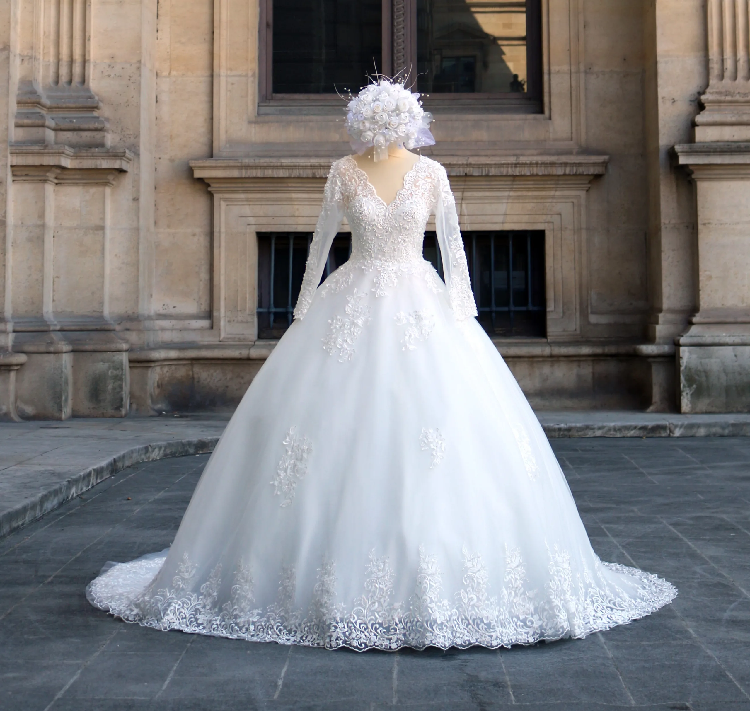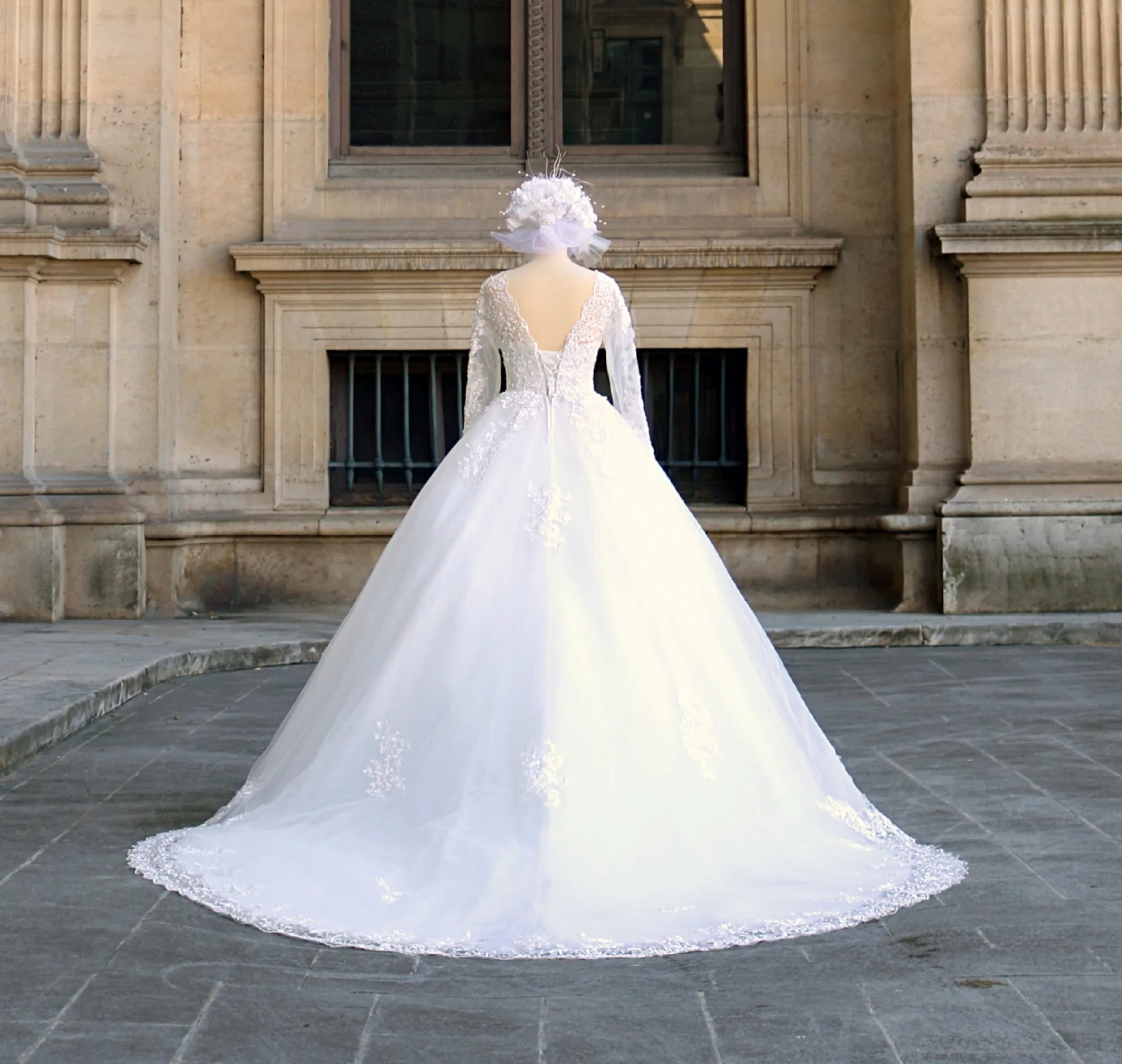 Contrairement à une robe de mariée simple, ce modèle joue avec les textures. Le bustier en col V allonge la silhouette avec élégance, tandis que les perles et les cristaux parsemés sur le corsage captent la lumière à chaque mouvement. C’est cette attention aux détails qui fait de cette robe de mariée manches longues une pièce de haute couture accessible, idéale pour celles qui souhaitent porter une robe unique et féerique.