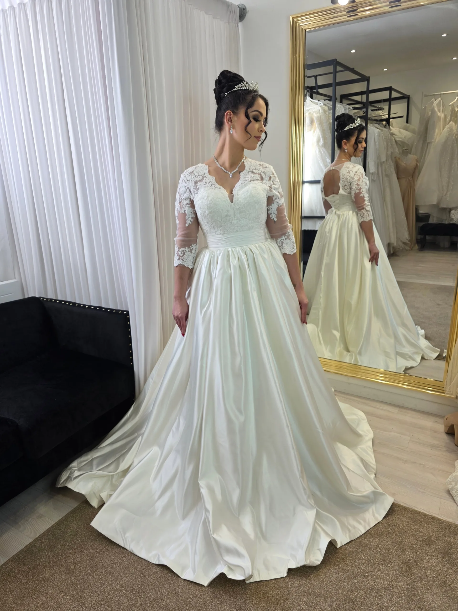 Robe de mariée princesse satin et dentelle – Manches 3/4 – Dos élégant – Coupe royale