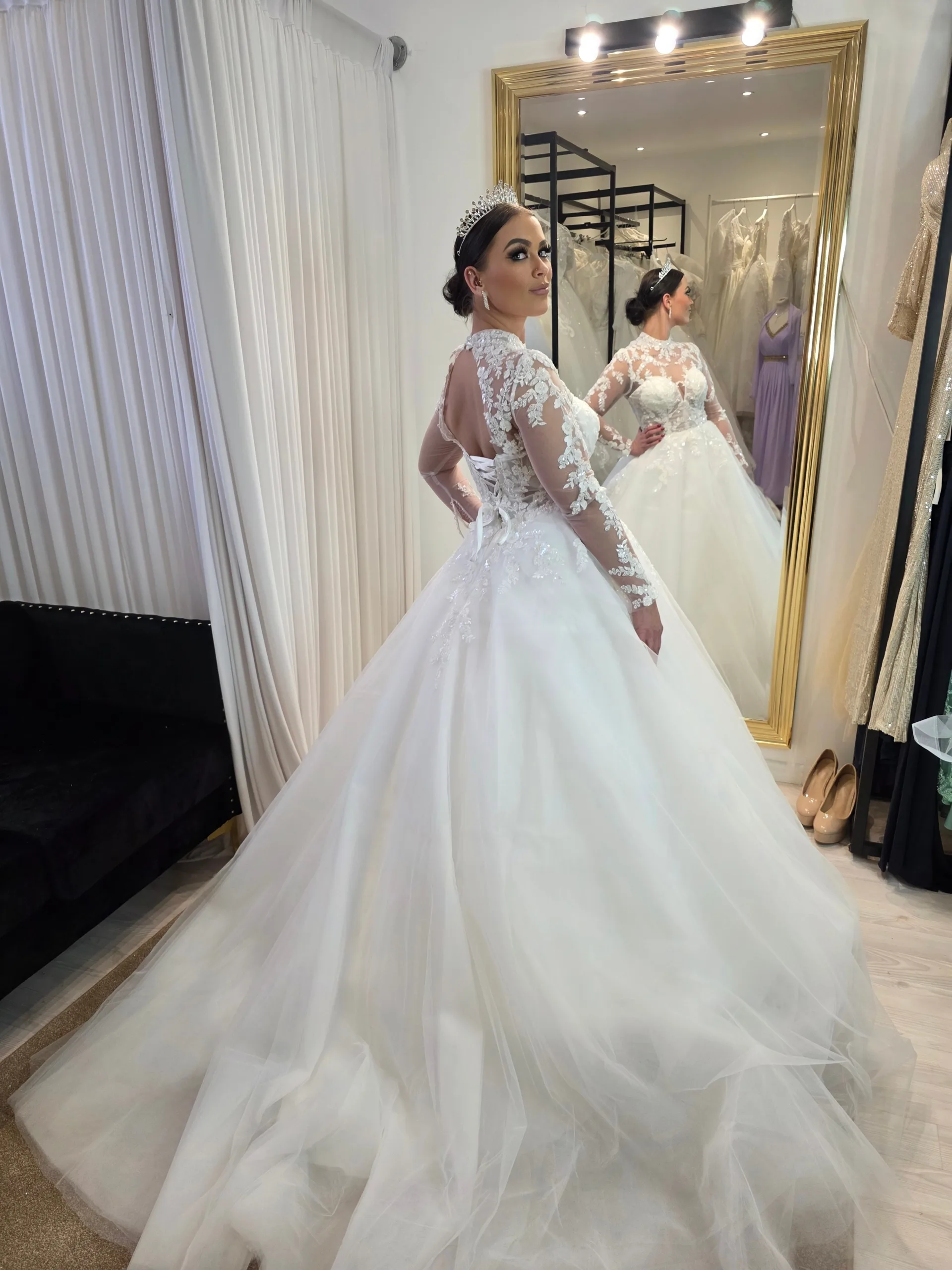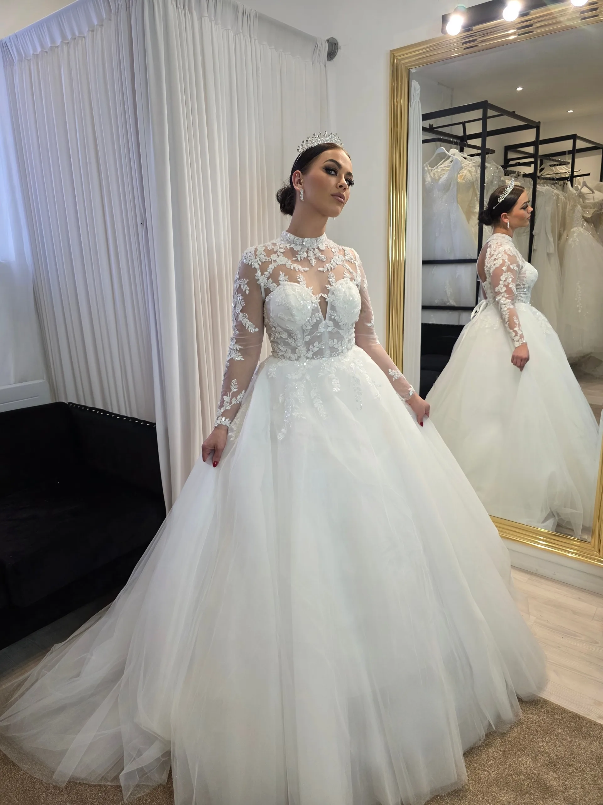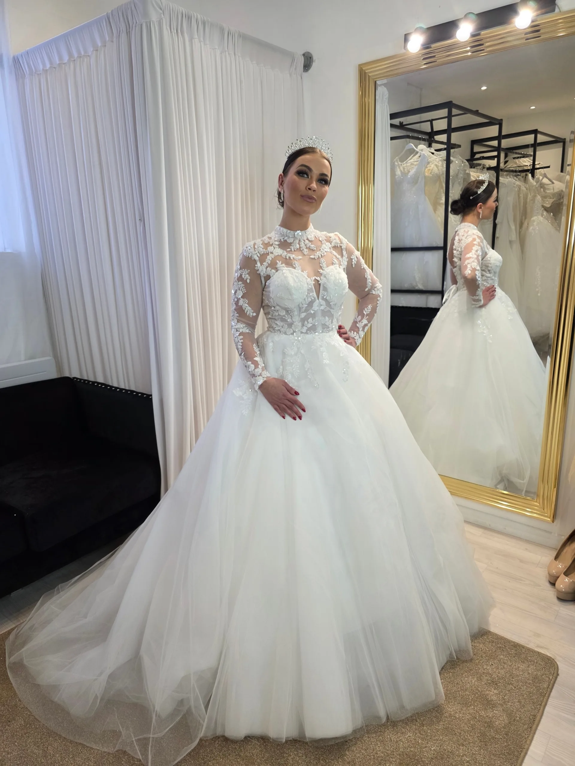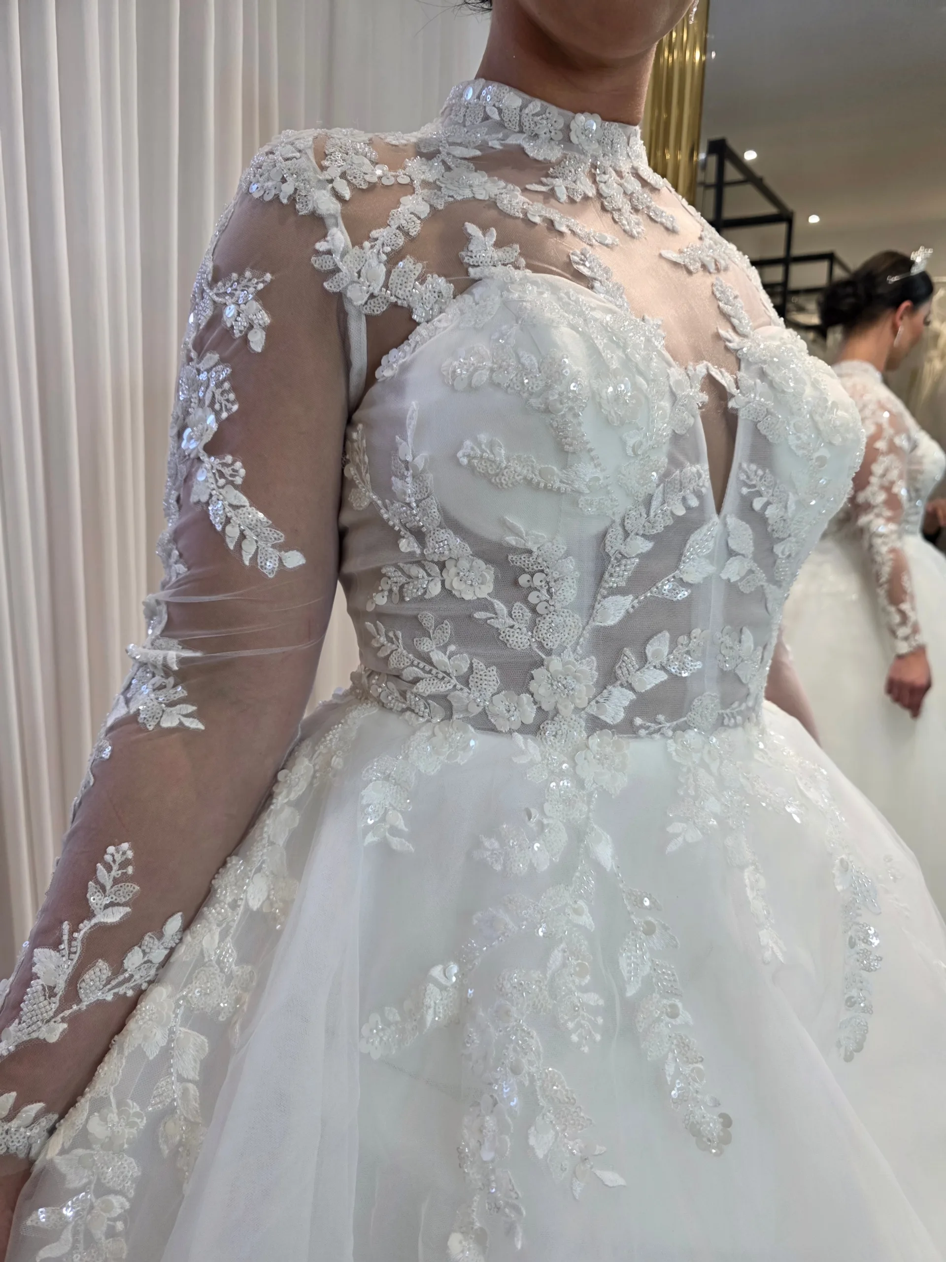 L’originalité de cette robe de mariée trapèze tient à son col haut montant. Véritable détail bijou, ce col habille le cou avec une délicatesse infinie, offrant un style plus couvert et hautement sophistiqué. Le bustier est entièrement rebrodé de dentelle perlée, un travail de broderie minutieux qui capte la lumière à chaque mouvement. Les manches longues en tulle dentelle ajoutent une note de féminité et d’élégance intemporelle, faisant de cette robe de mariée trapèze une pièce maîtresse de notre nouvelle collection.