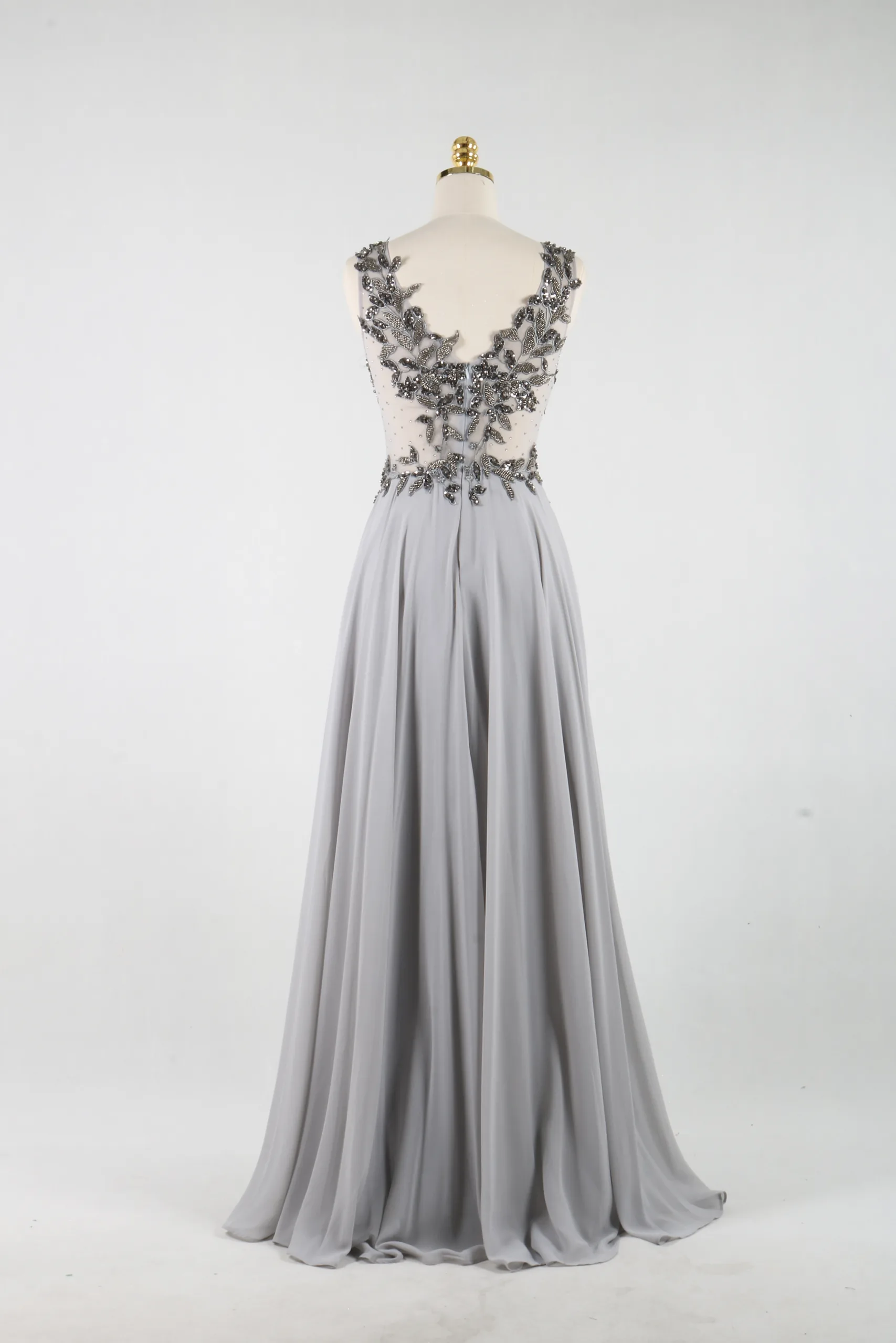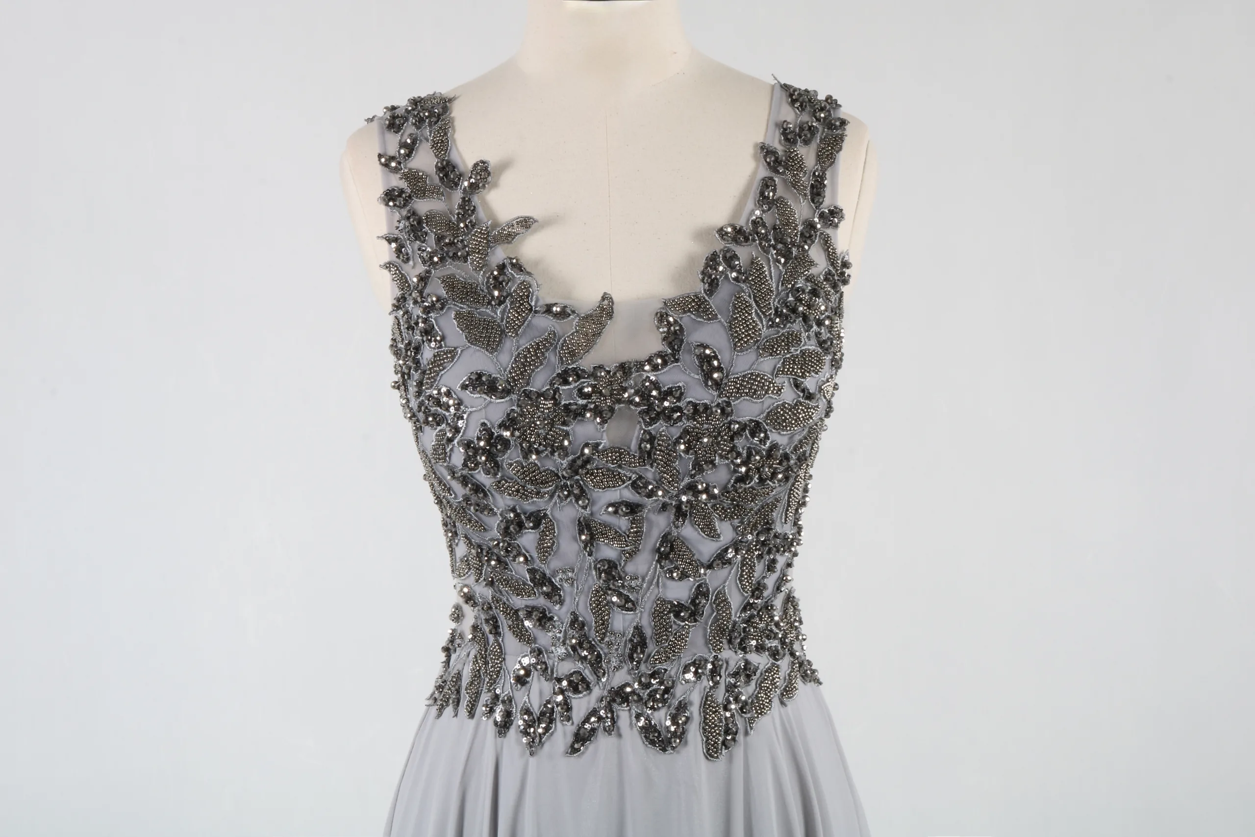 Le haut de la robe est entièrement orné de broderies délicates et raffinées, travaillées avec une grande précision. Les motifs élégants apportent du relief et une touche précieuse à l’ensemble, tout en captant subtilement la lumière. Cette richesse décorative confère à la robe un esprit couture, parfait pour les grandes occasions.