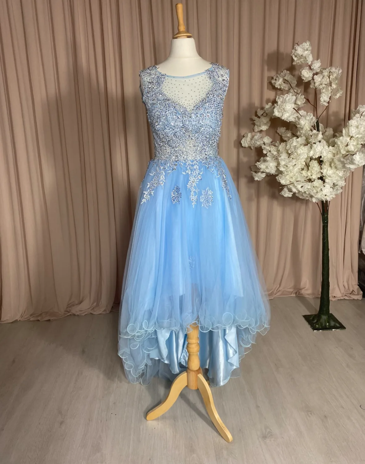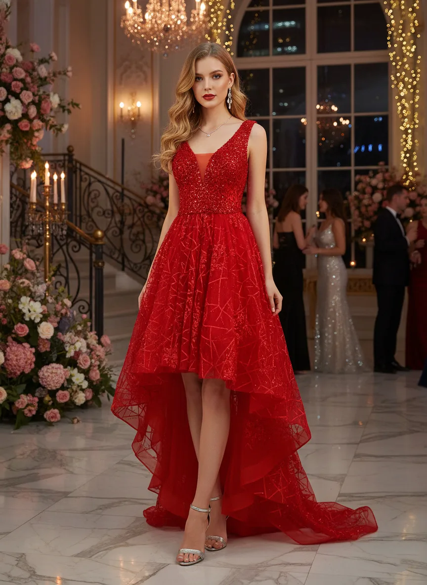 La robe présente une coupe asymétrique, courte à l’avant et légèrement plus longue à l’arrière grâce à une traîne délicate. Cette forme apporte une dimension théâtrale et élégante, tout en mettant en valeur les jambes. La longueur courte à l’avant permet d’allonger visuellement la silhouette, offrant une allure dynamique et féminine. La traîne arrière, quant à elle, apporte une touche de majesté et de mouvement, créant un effet de glisse lorsque vous marchez ou dansez. Ce contraste entre la partie avant et la partie arrière donne à la robe une esthétique unique, parfaite pour celles qui souhaitent se démarquer tout en restant sophistiquées.