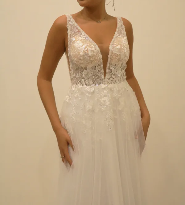 Cette création est pensée pour les mariées qui aiment le style épuré mais travaillé, avec une attention particulière aux détails scintillants et aux finitions de couture. La combinaison du décolleté en V, de la dentelle scintillante et du tulle fluide crée une harmonie parfaite entre modernité et romantisme classique.