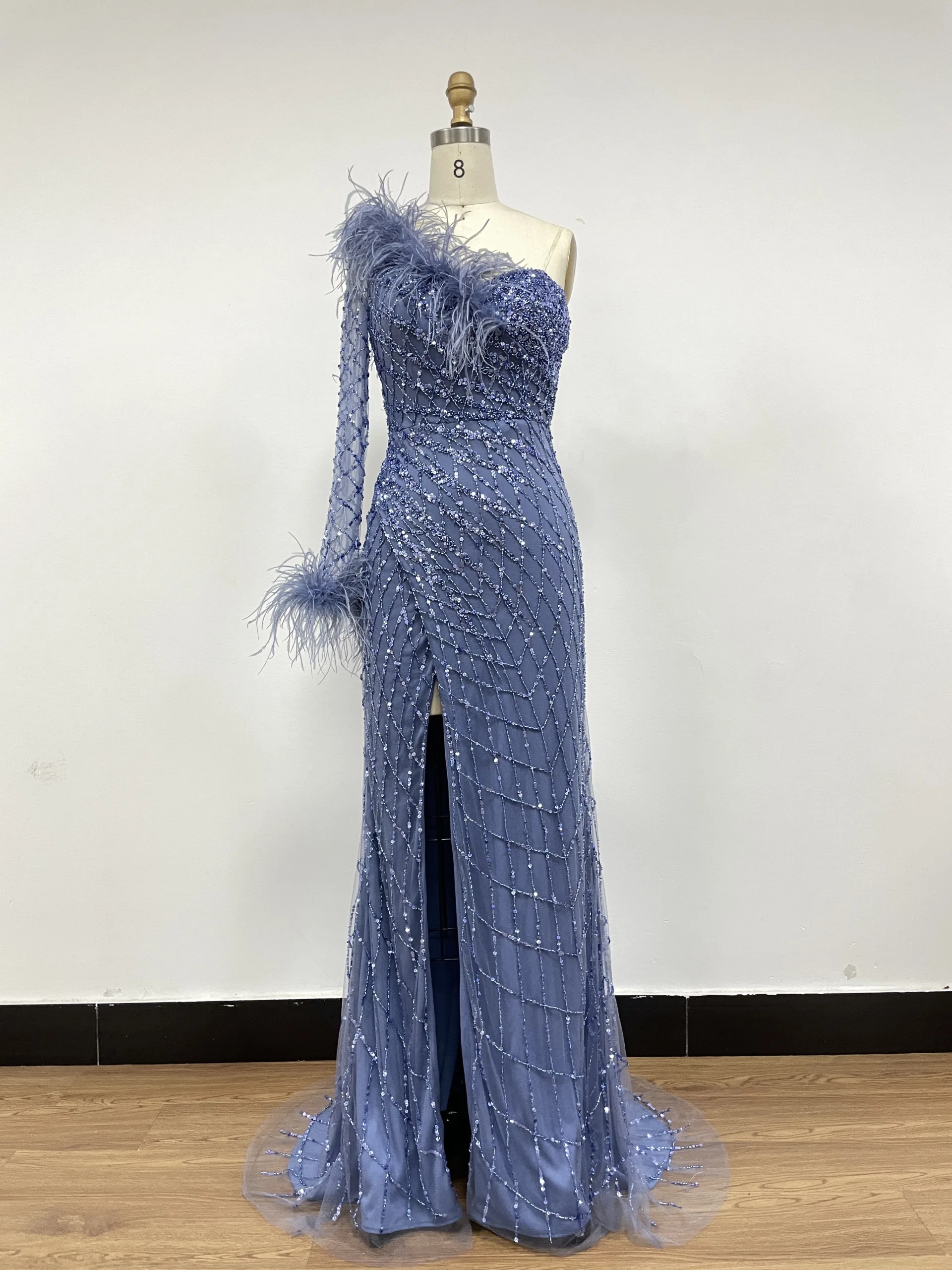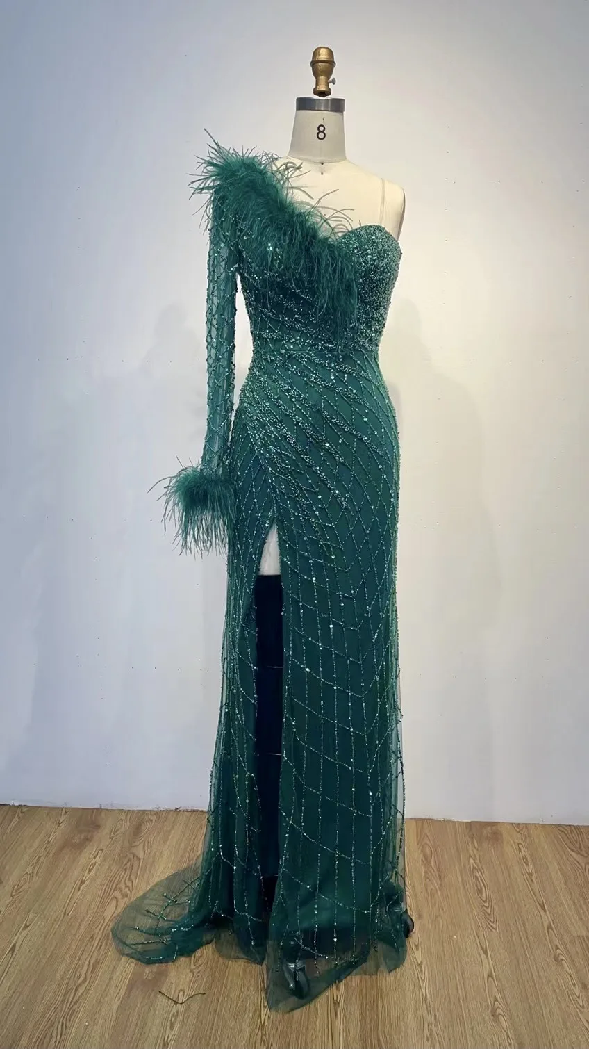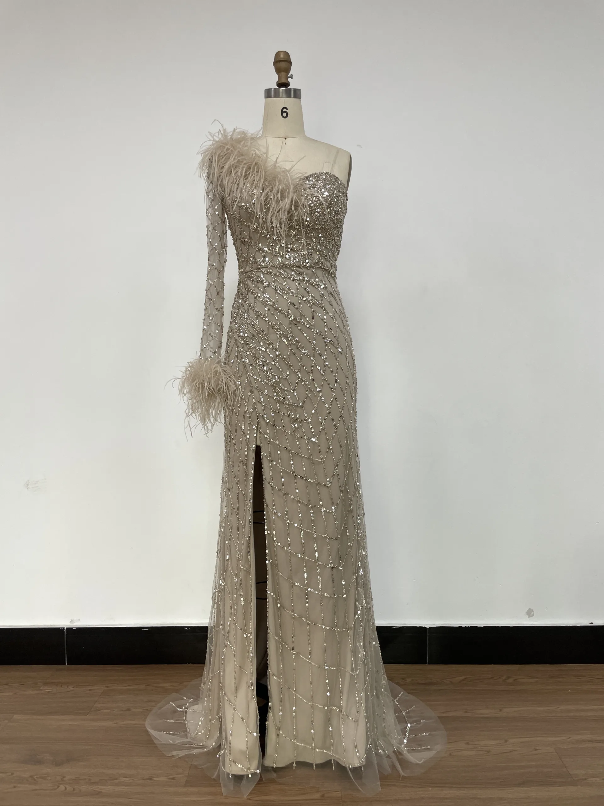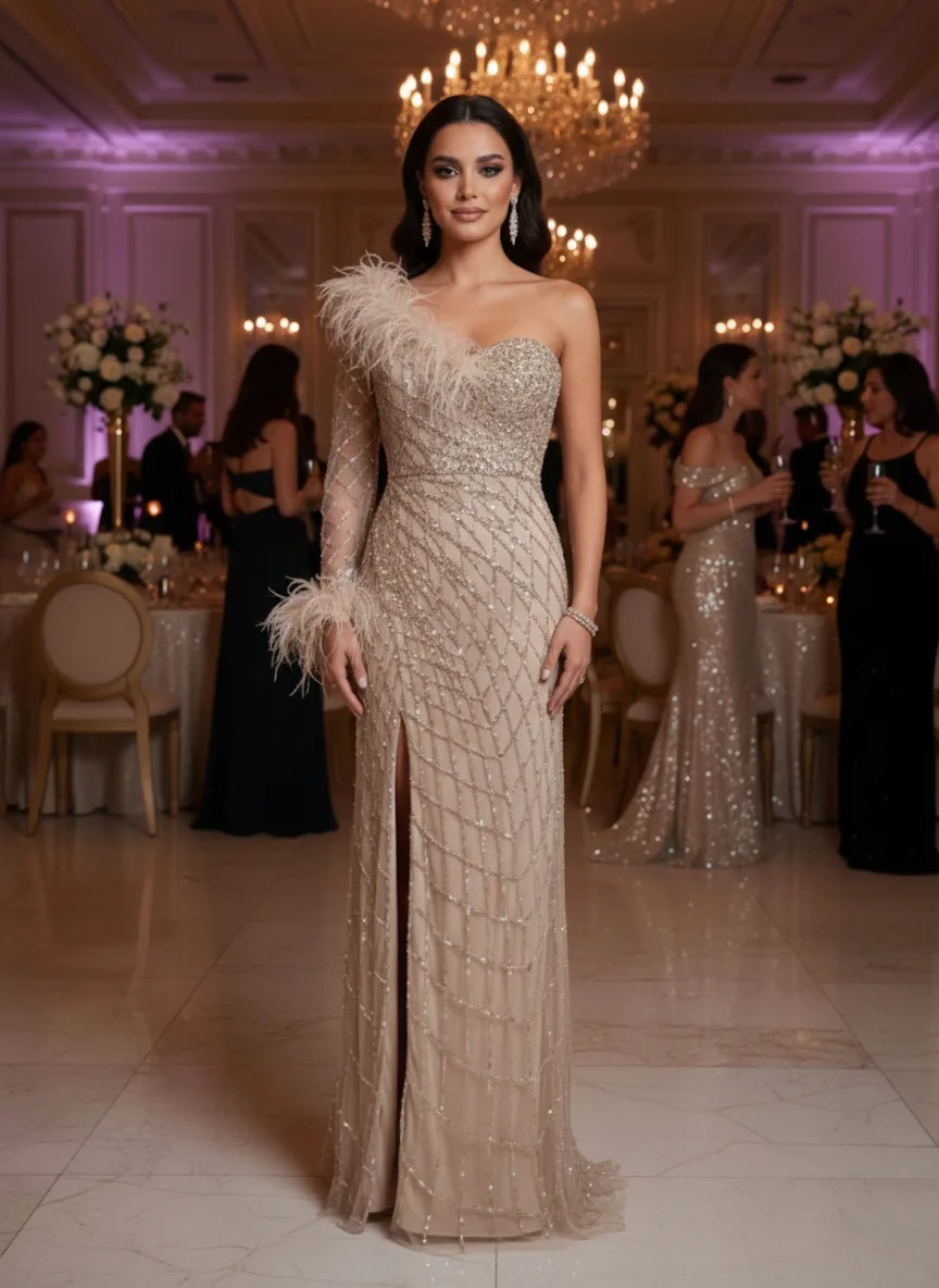 Robe Haute Couture Longue – Coupe Droite, Paillettes Délicates et Manche Plume Asymétrique