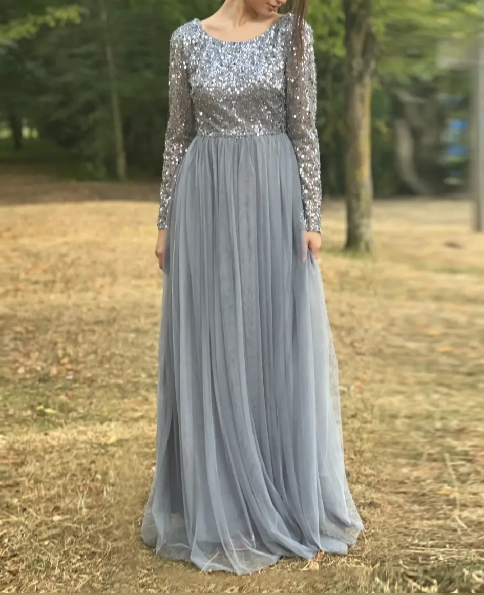 Cette robe longue associe un bustier entièrement recouvert de paillettes lumineuses à une jupe fluide en tulle plissé. Les manches longues transparentes apportent une touche élégante et délicate, tandis que la jupe légère crée un mouvement aérien. Une robe idéale pour une cérémonie, un gala ou un événement où l’élégance doit être au rendez-vous.