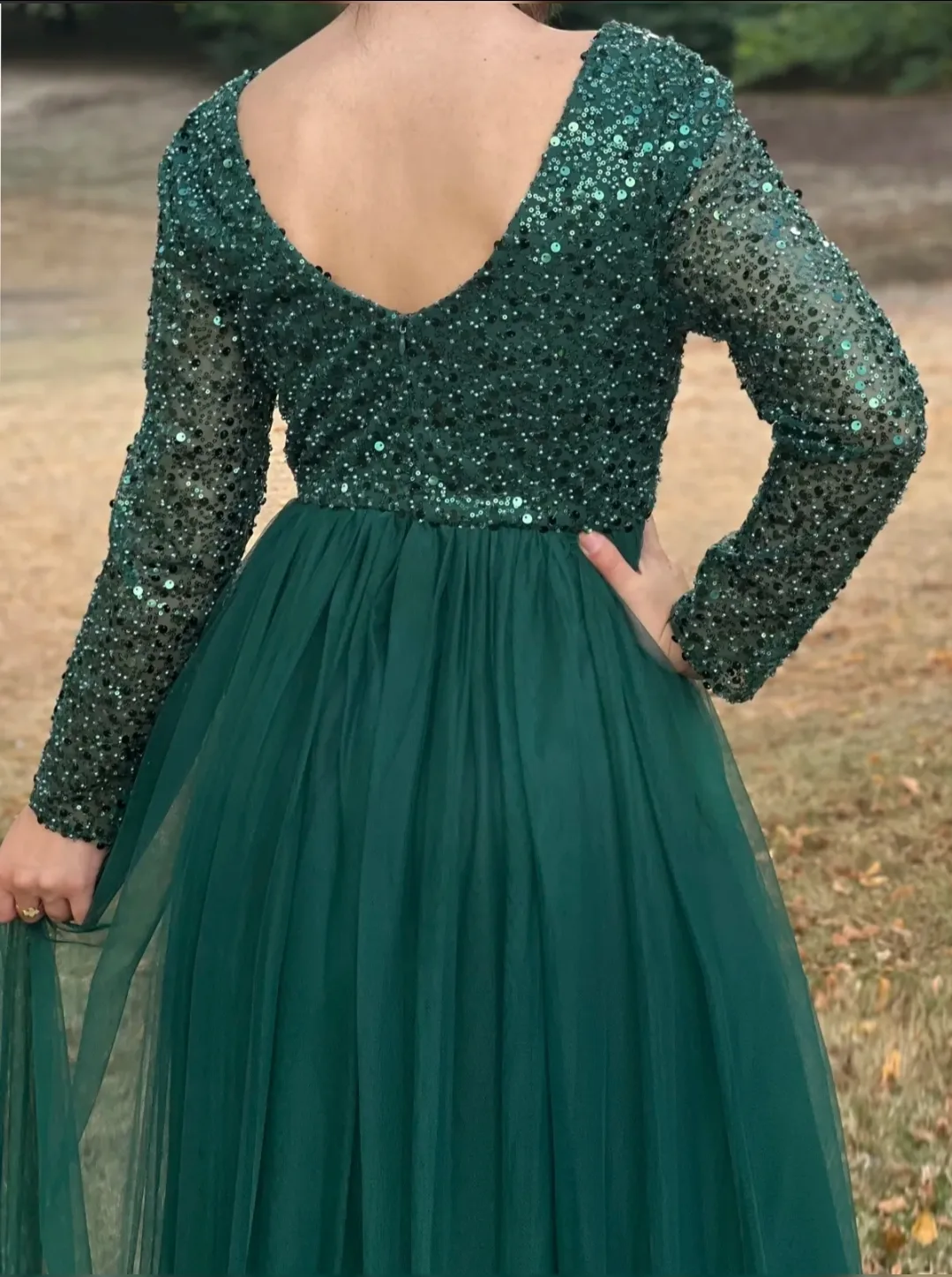 Les manches longues sont réalisées dans un tissu léger et légèrement transparent, qui laisse subtilement apparaître la peau tout en conservant l’élégance d’une robe habillée. Elles sont également ornées de paillettes, ce qui prolonge l’effet lumineux du bustier jusqu’aux poignets. Cette continuité donne à la robe une allure particulièrement chic et cohérente. Les manches apportent également une dimension plus habillée et permettent de porter la robe lors d’événements en toute saison.