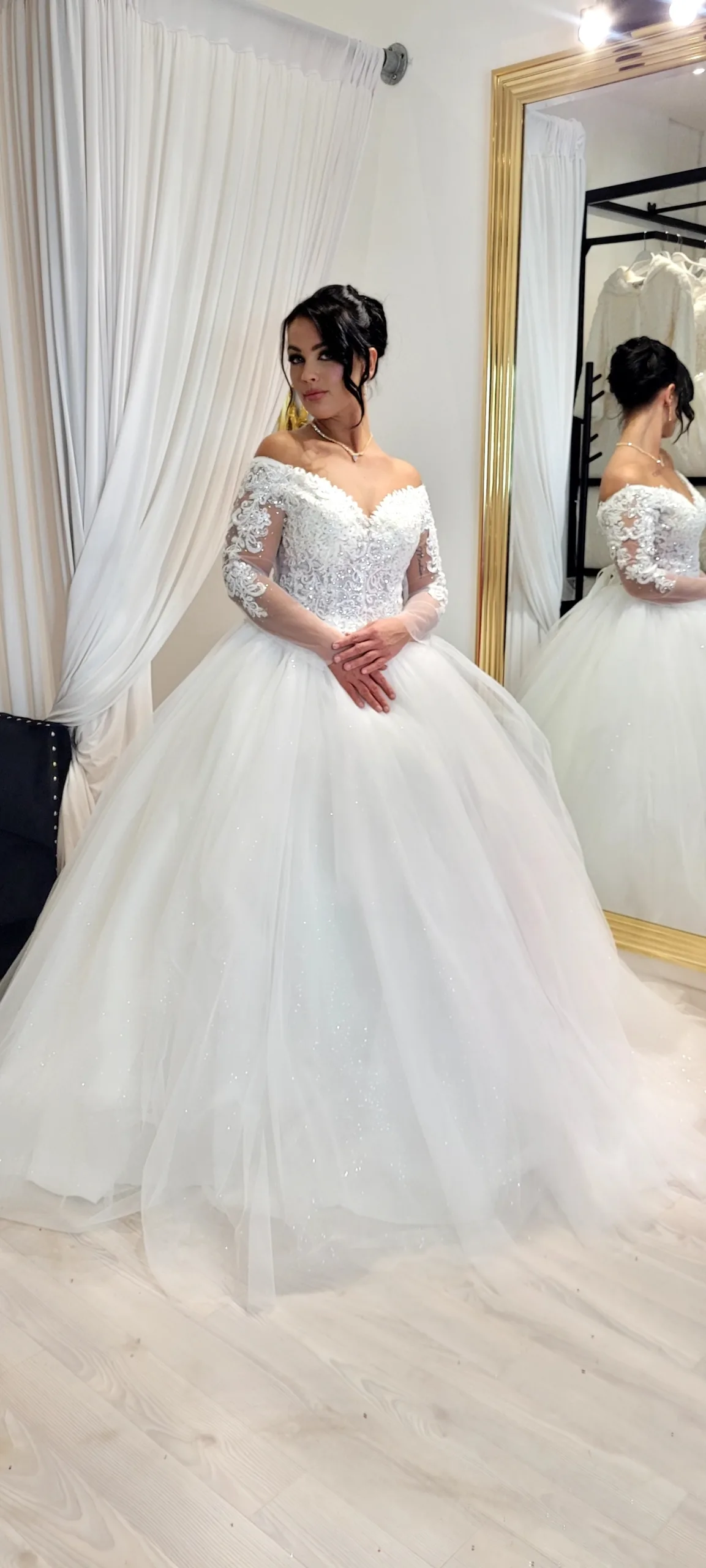 Robe de mariée princesse à manches longues en dentelle et tulle scintillant