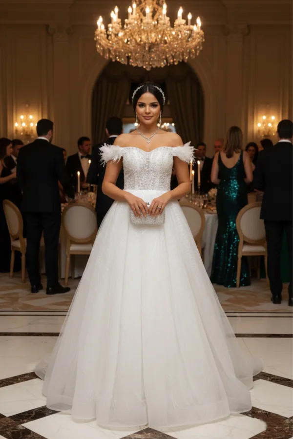 Cette robe de mariée princesse à bustier perlé séduit par son élégance lumineuse et son allure résolument romantique. Son bustier structuré en forme cœur, entièrement orné de perles et de broderies scintillantes, épouse parfaitement le buste et met en valeur le décolleté avec finesse. Les manches tombantes délicatement décorées de plumes apportent une touche aérienne et couture, tout en soulignant les épaules et le port de tête.
