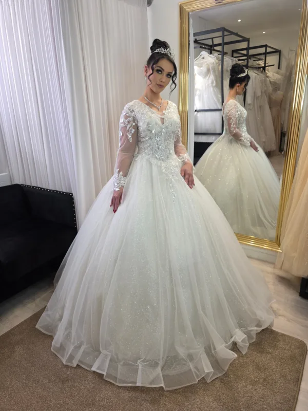 Robe de mariée princesse scintillante manches longues – Dentelle, paillettes et jupe volumineuse