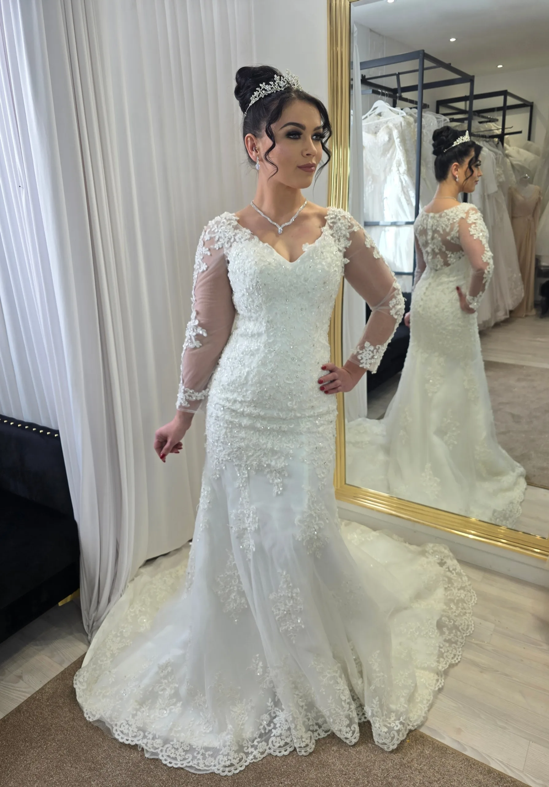 Robe de mariée sirène en dentelle col V – Manches longues et petite traîne élégante