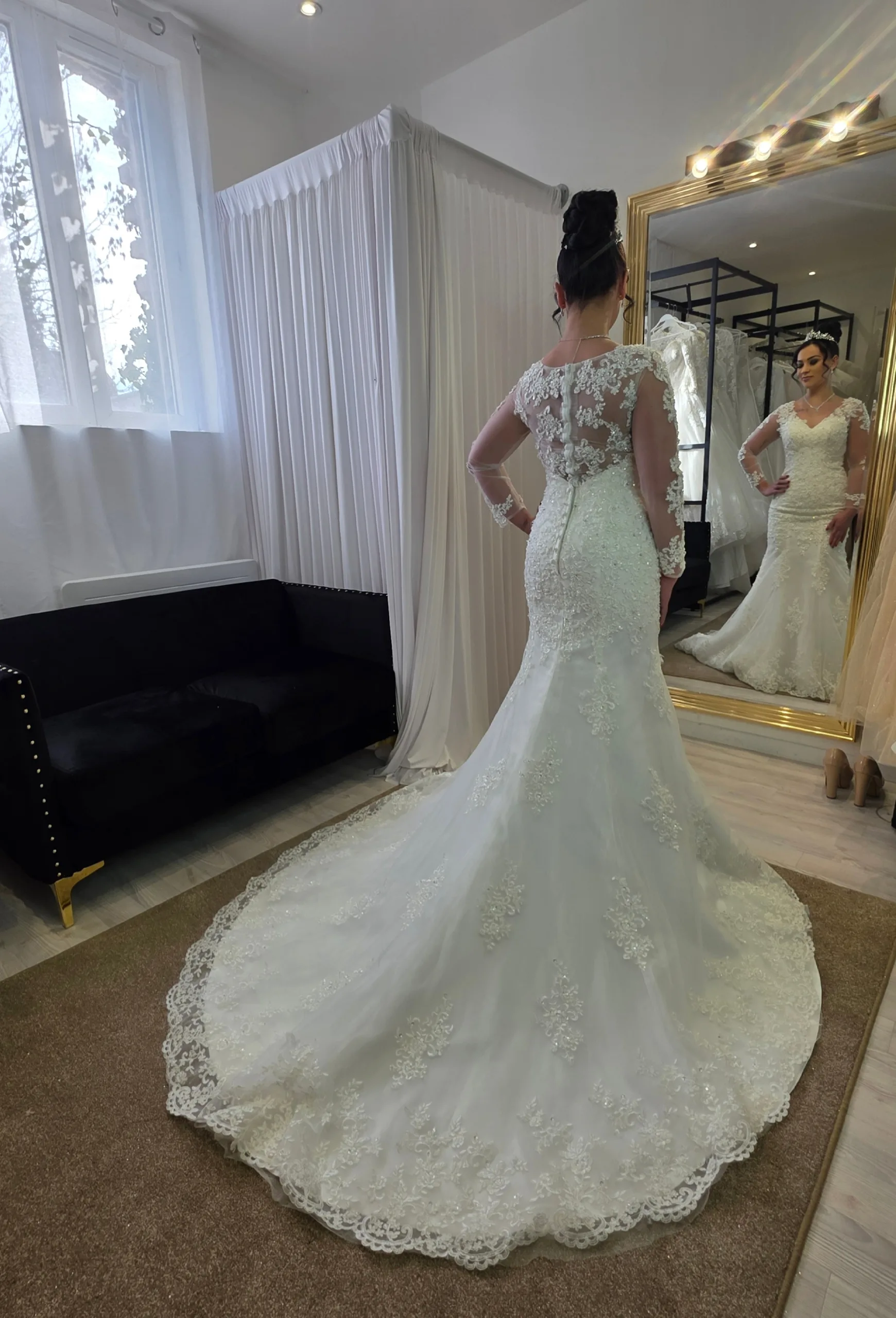 Elle apporte une touche cérémoniale sans alourdir la silhouette. Elle permet de conserver l’élégance d’une robe de mariée traditionnelle tout en restant pratique pour la marche, la réception et l’ouverture de bal.