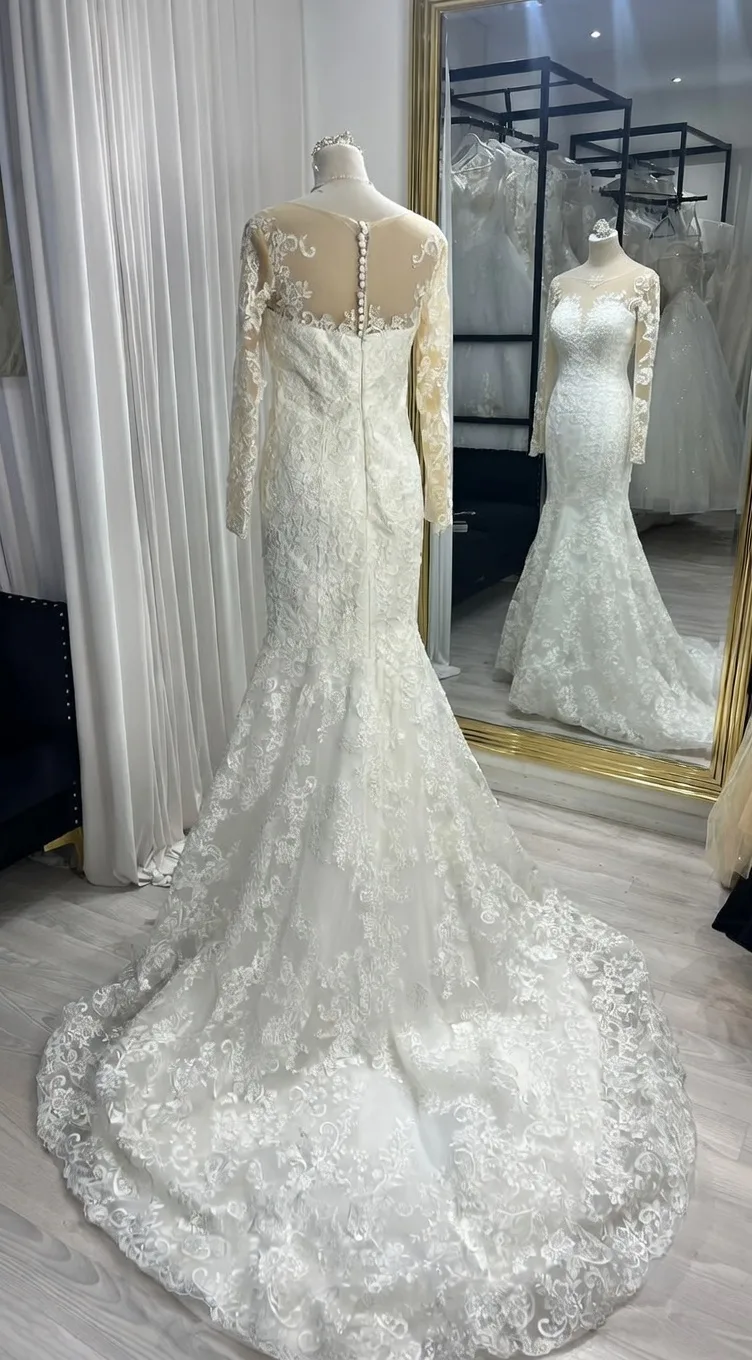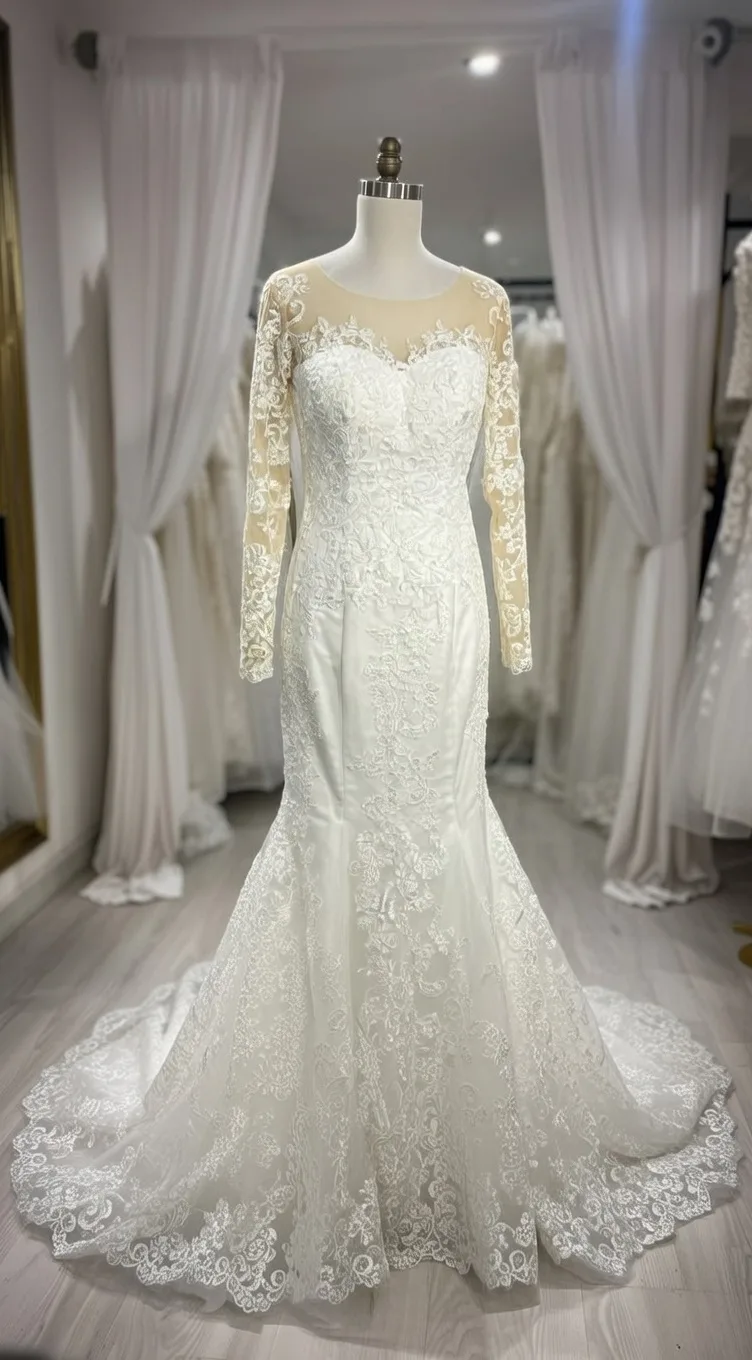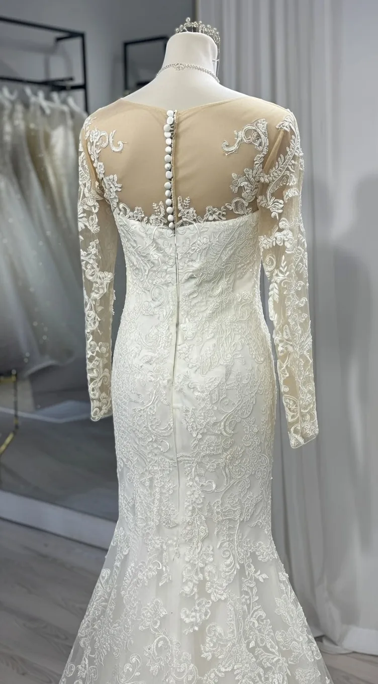 Cette robe de mariée sirène séduit par sa dentelle raffinée et son élégant effet illusion. Son corsage structuré, ses manches longues délicatement brodées et sa coupe près du corps subliment la silhouette avec féminité. Une création sophistiquée et intemporelle, parfaite pour une mariée élégante et affirmée.