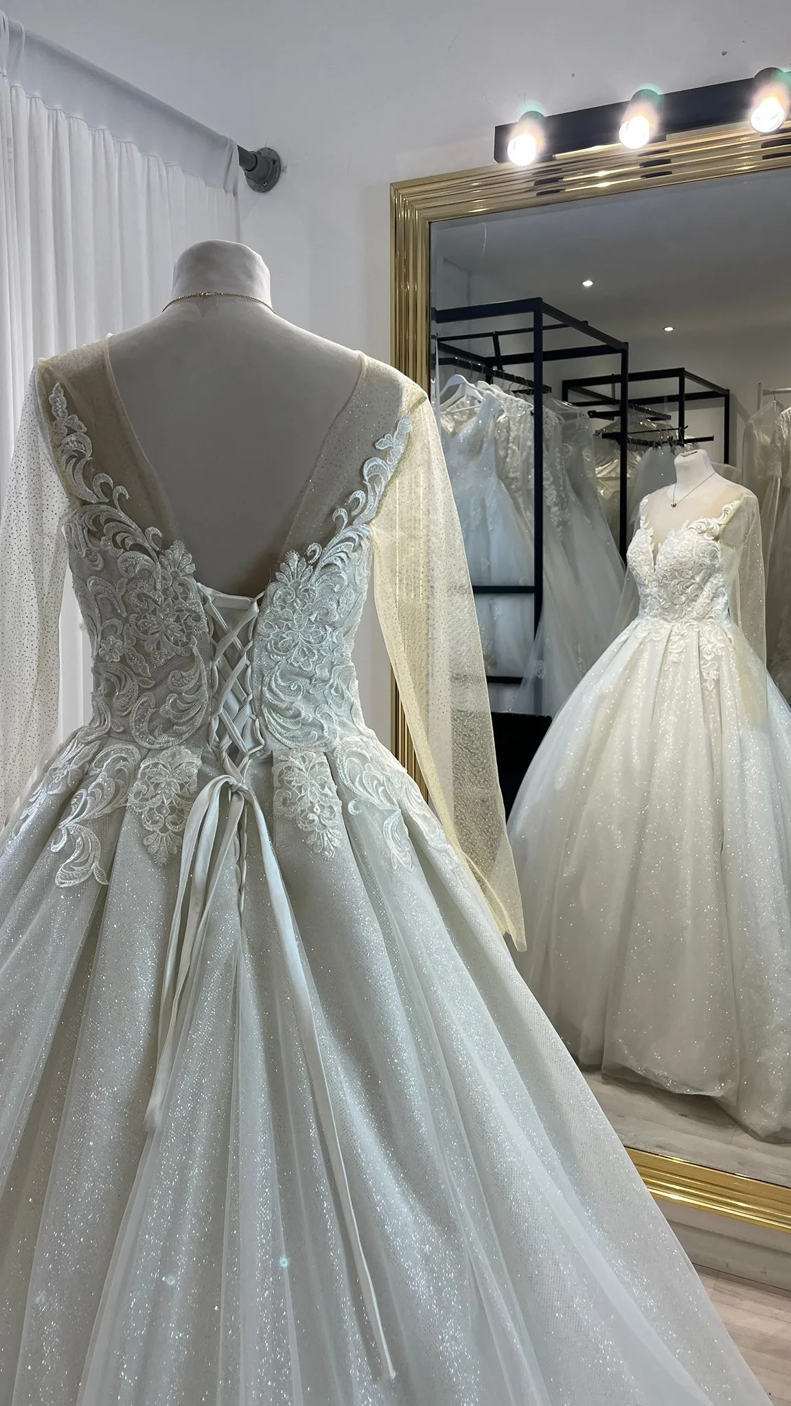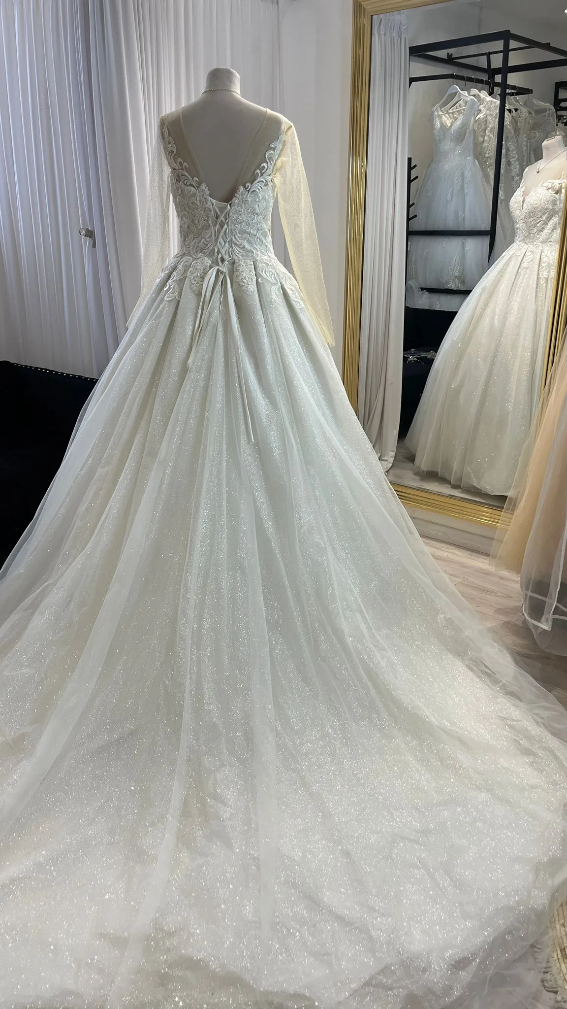 Le bas de la robe est une jupe princesse généreuse, conçue pour créer un effet spectaculaire dès que la mariée entre dans la pièce. Cette jupe volumineuse est entièrement recouverte de paillettes, offrant un rendu lumineux et féerique. Chaque mouvement fait briller la robe, créant un jeu de lumière spectaculaire qui capte l’attention. La jupe apporte un volume royal tout en restant légère grâce à un tissu bien structuré, permettant à la mariée de se déplacer avec aisance. Elle est parfaite pour une entrée mémorable, une séance photo ou une cérémonie grandiose.
