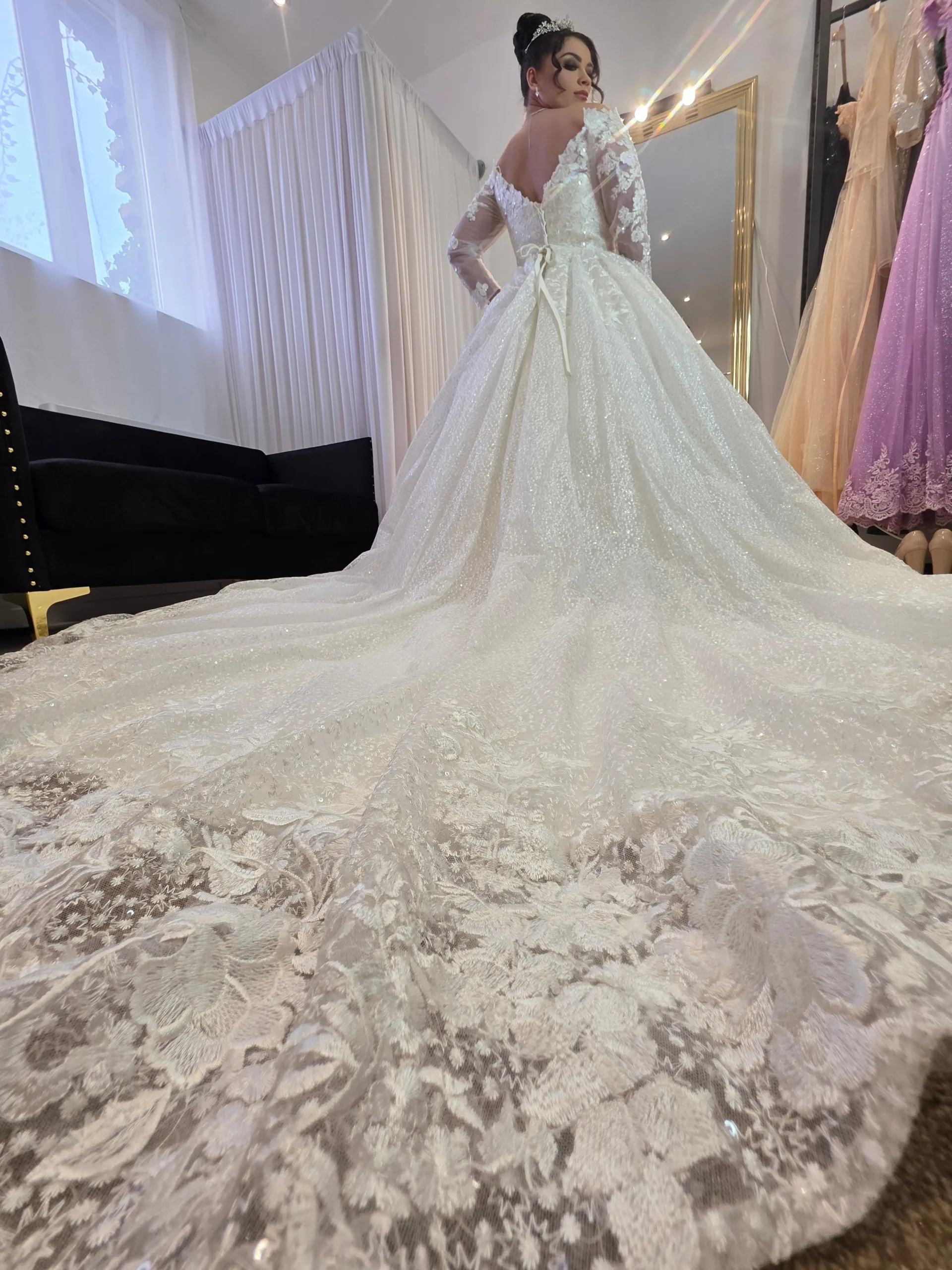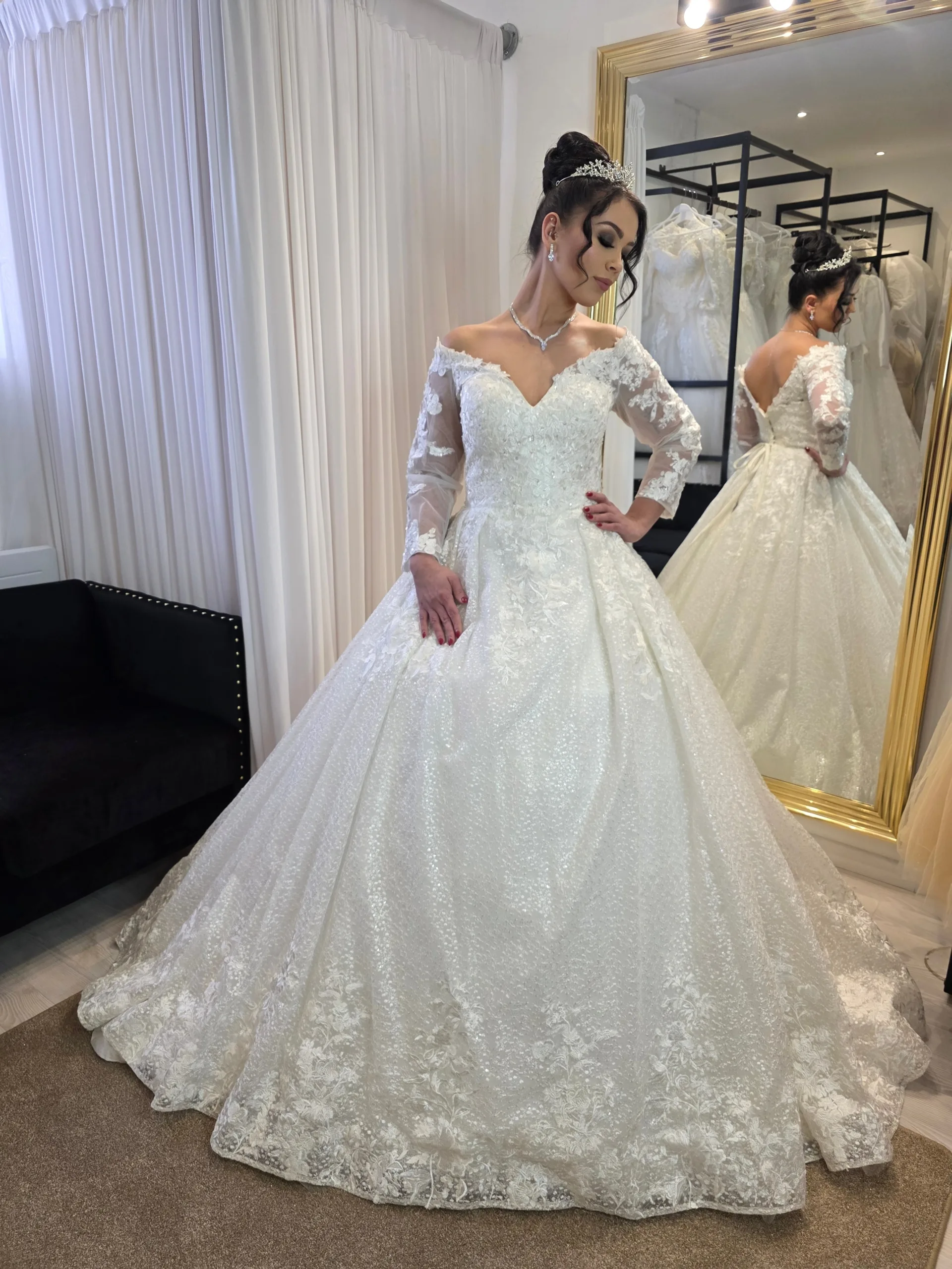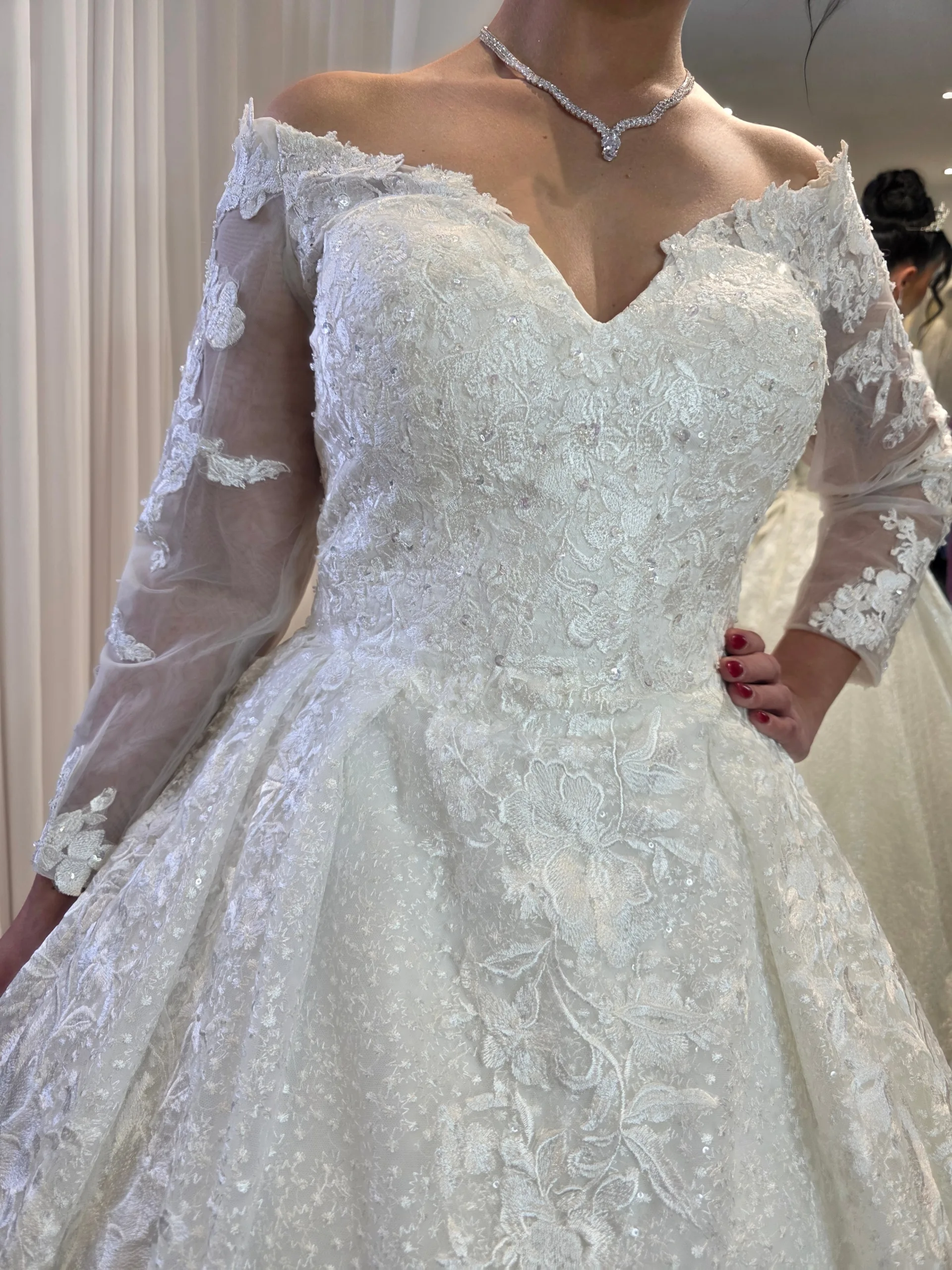 Magnifique robe princesse à col mi-épaule, manches longues en dentelle délicate et jupe brodée à motif floral. Son effet broderie descendant harmonieusement sur la jupe, sa petite traîne élégante et son dos travaillé en font une robe idéale pour les grands événements. Disponible à la location ou à la vente.