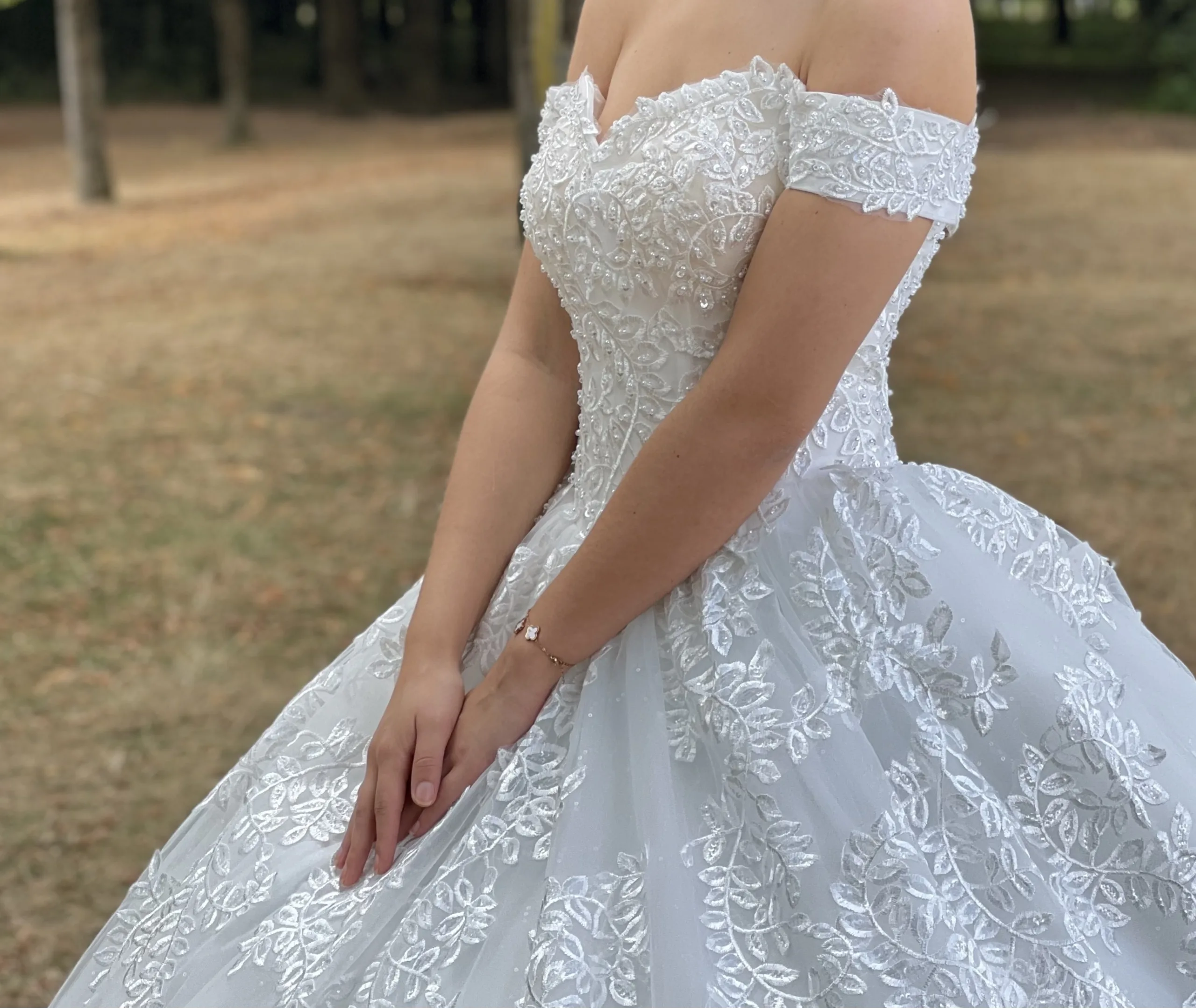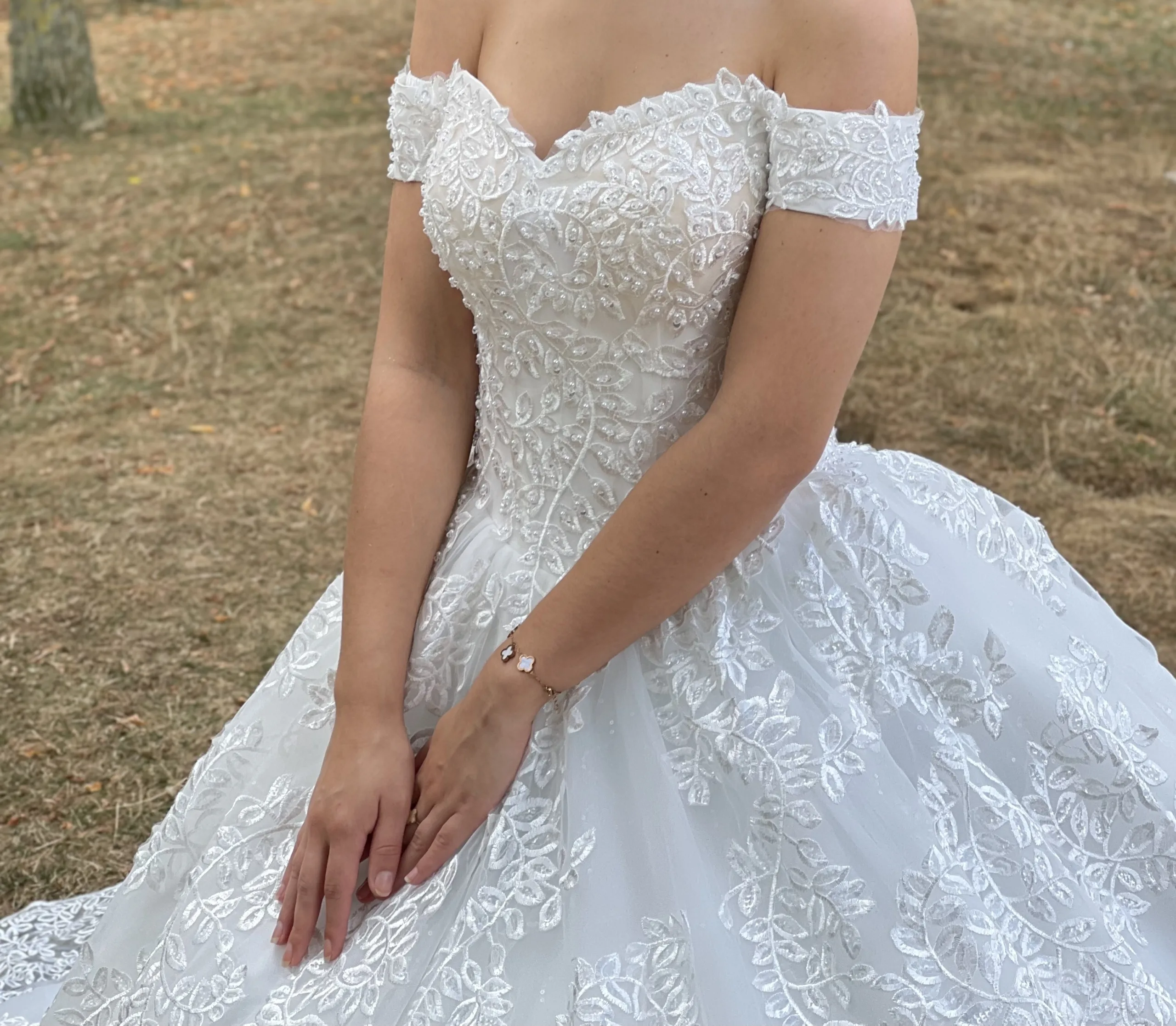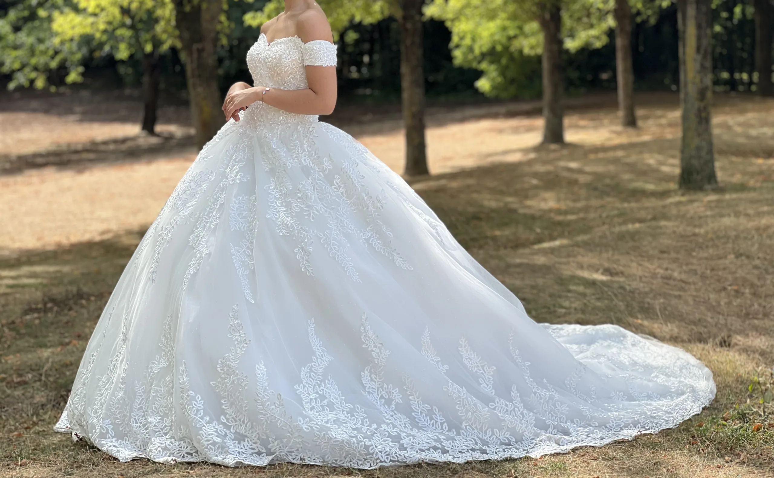 Robe de mariée princesse en dentelle à épaules dénudées