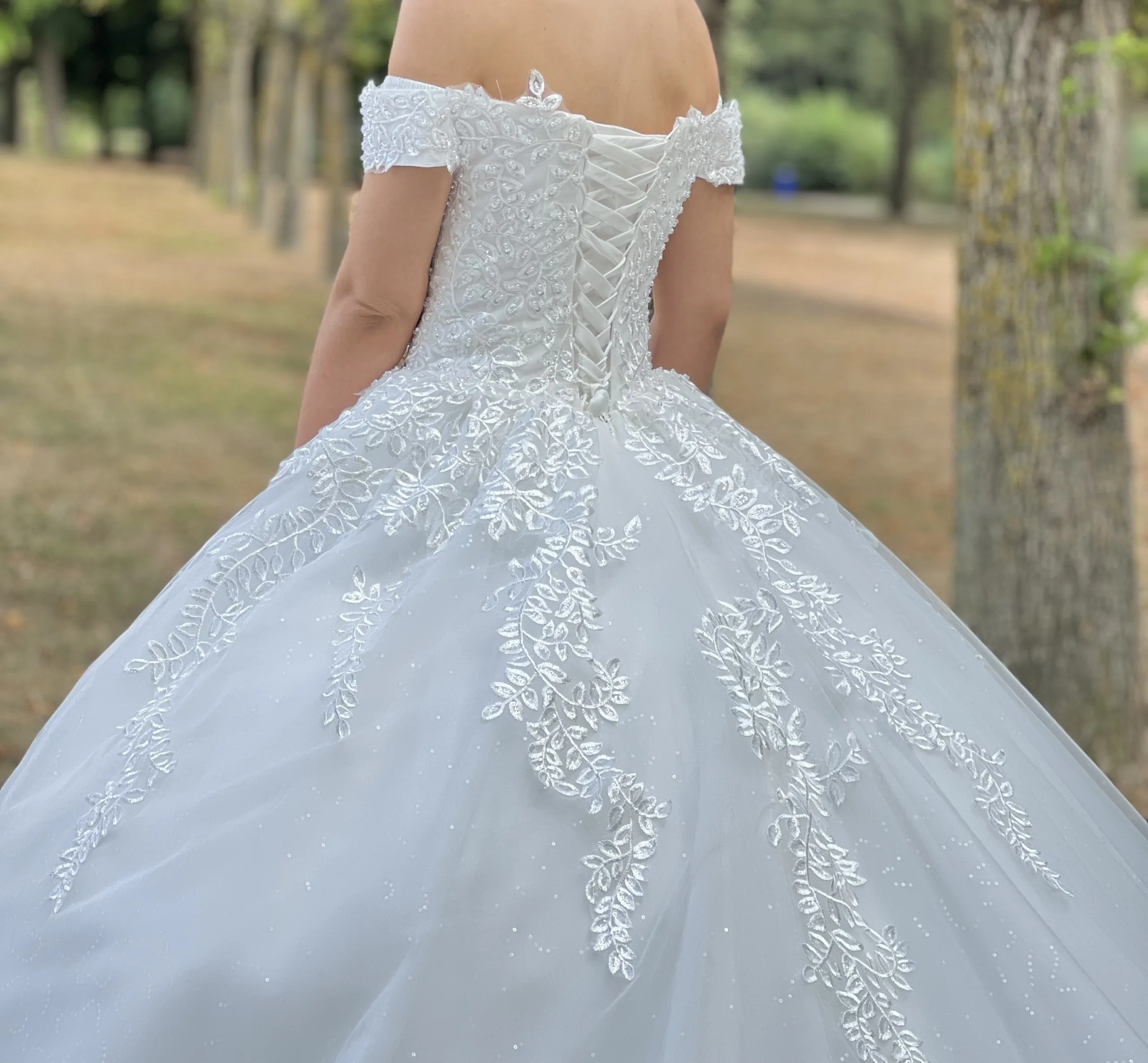 Les manches tombantes en dentelle ajoutent une note douce et féminine, très tendance, qui sublime les épaules et le port de tête. À l’arrière, le dos corseté souligne la taille avec élégance, créant une silhouette harmonieuse et parfaitement équilibrée.
