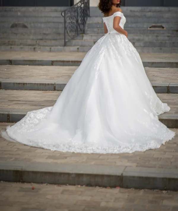 Robe de mariée style princesse confectionnée en dentelle raffinée, idéale pour une mariée à la recherche d’élégance et de romantisme. Le corsage ajusté met en valeur la silhouette grâce à son décolleté en coeur et ses épaules dénudées délicatement ornées de dentelles.