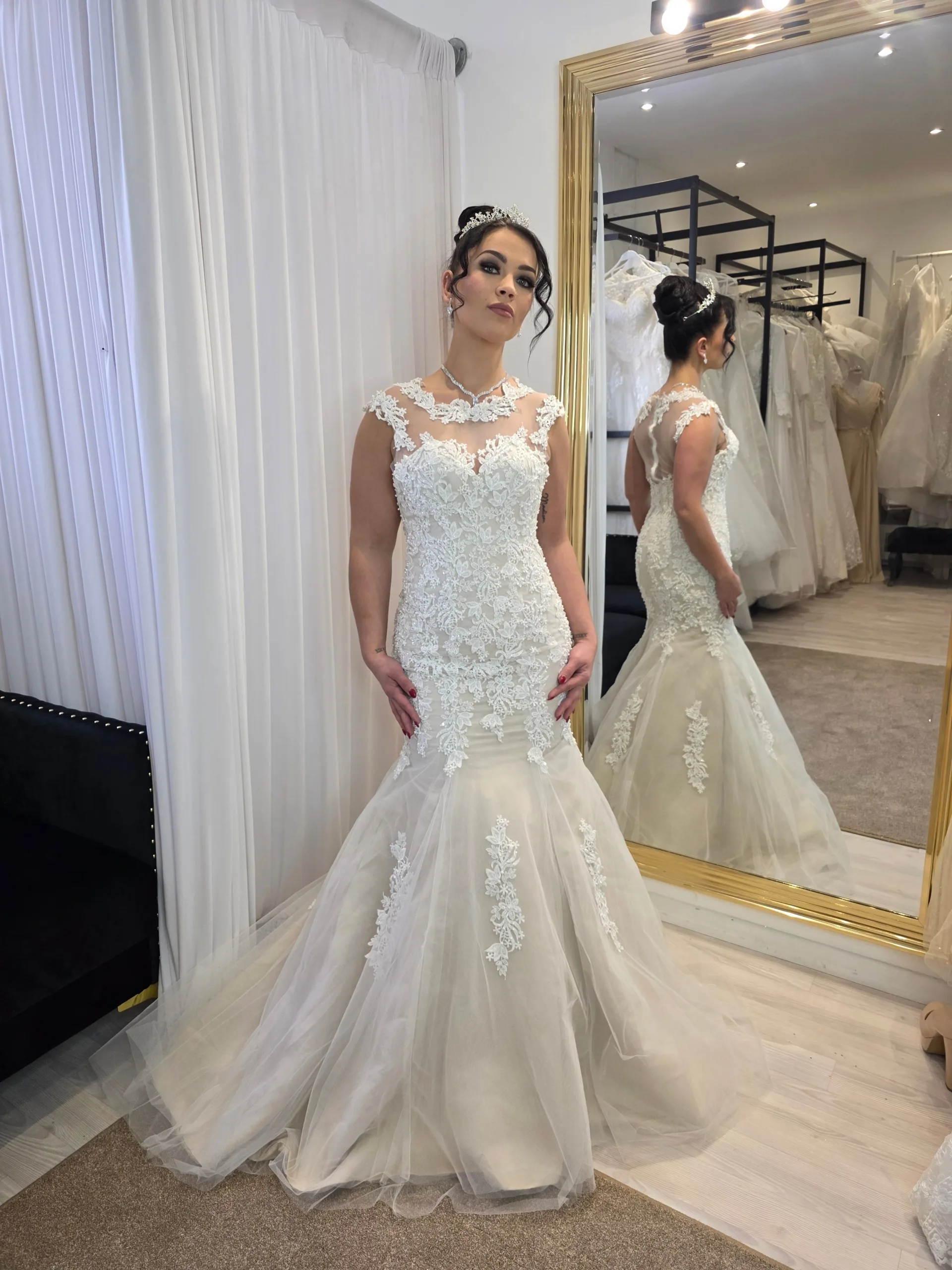 Robe de mariée coupe sirène en dentelle florale avec base nude et jupe en tulle léger. Une silhouette glamour et féminine qui épouse parfaitement les courbes.
