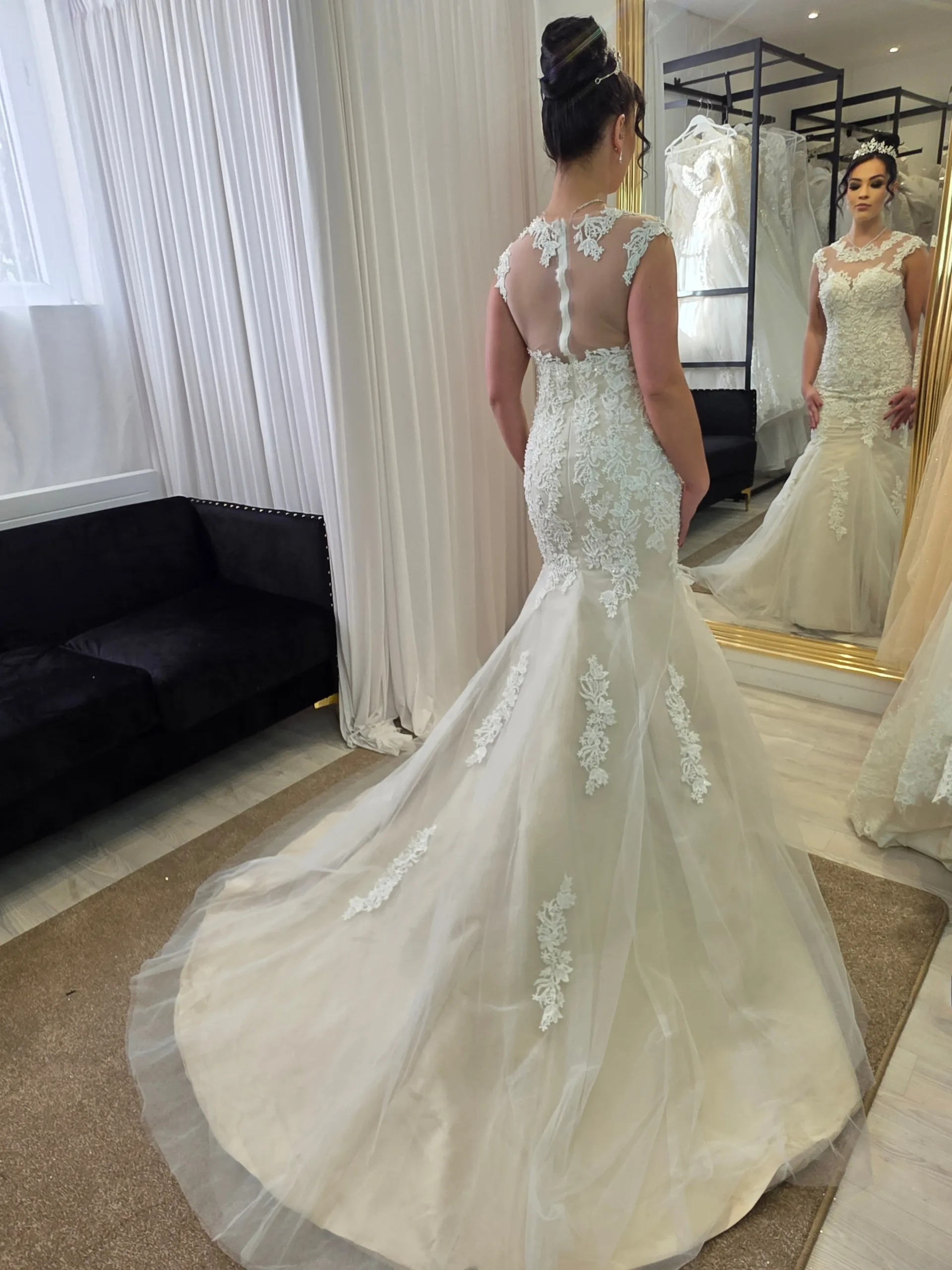 Le dos est travaillé en transparence avec dentelle appliquée, offrant une touche romantique et sensuelle. La fermeture est discrète pour ne pas casser la continuité des motifs.