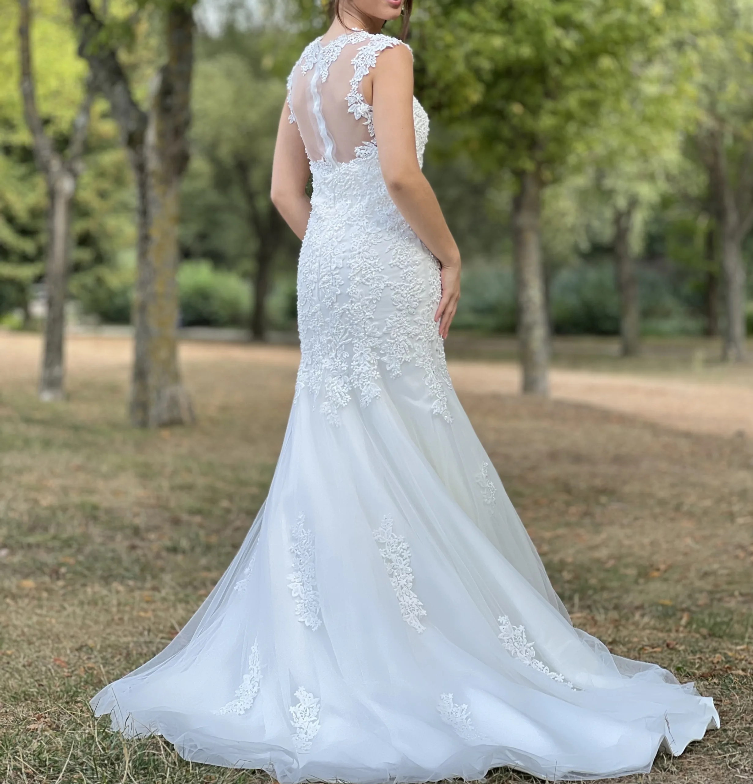 Cette robe de mariée sirène est le choix parfait pour les mariées qui souhaitent une allure sensuelle, élégante et moderne. Sa coupe près du corps sublime les courbes naturelles tout en conservant une grande finesse grâce à la dentelle florale brodée sur fond nude.