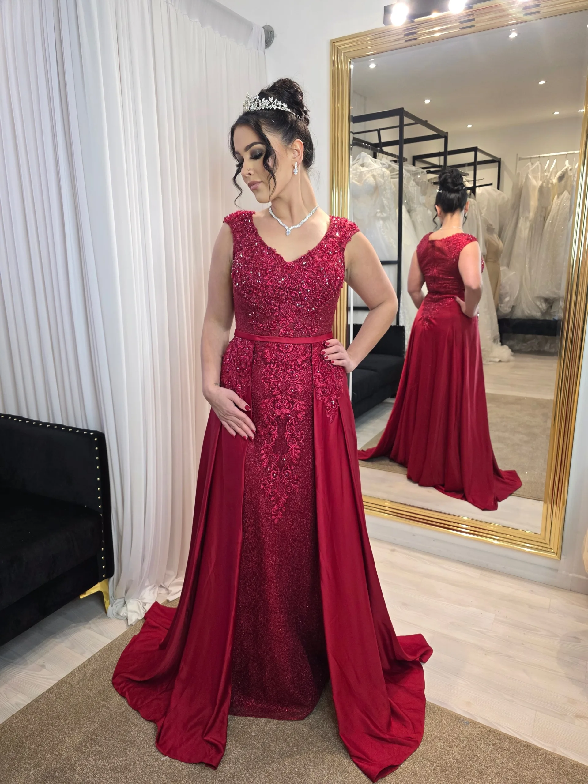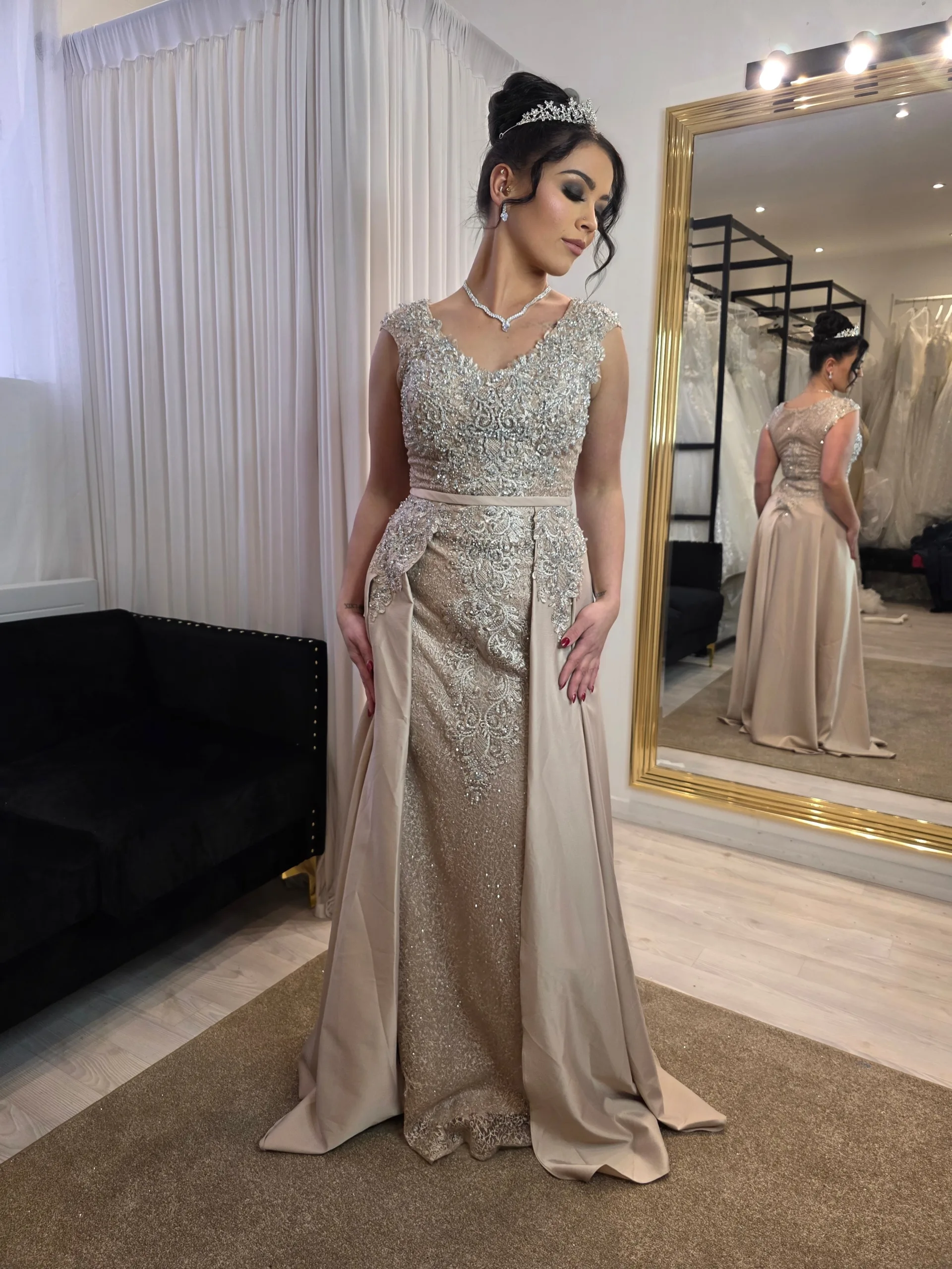 Côté coiffure, un chignon structuré ou des cheveux légèrement ondulés apportent un style romantique qui complète parfaitement l’élégance de la robe. Un maquillage lumineux avec un teint naturel, un regard souligné et une bouche délicatement mise en valeur renforcera l’effet glamour sans surcharger l’ensemble.