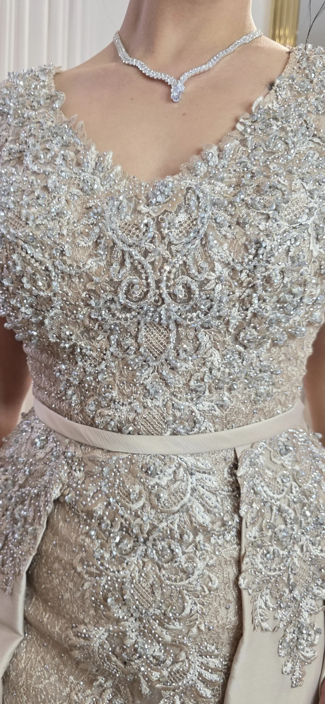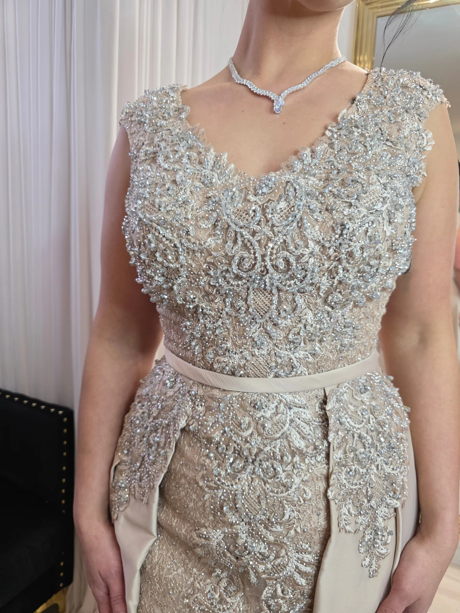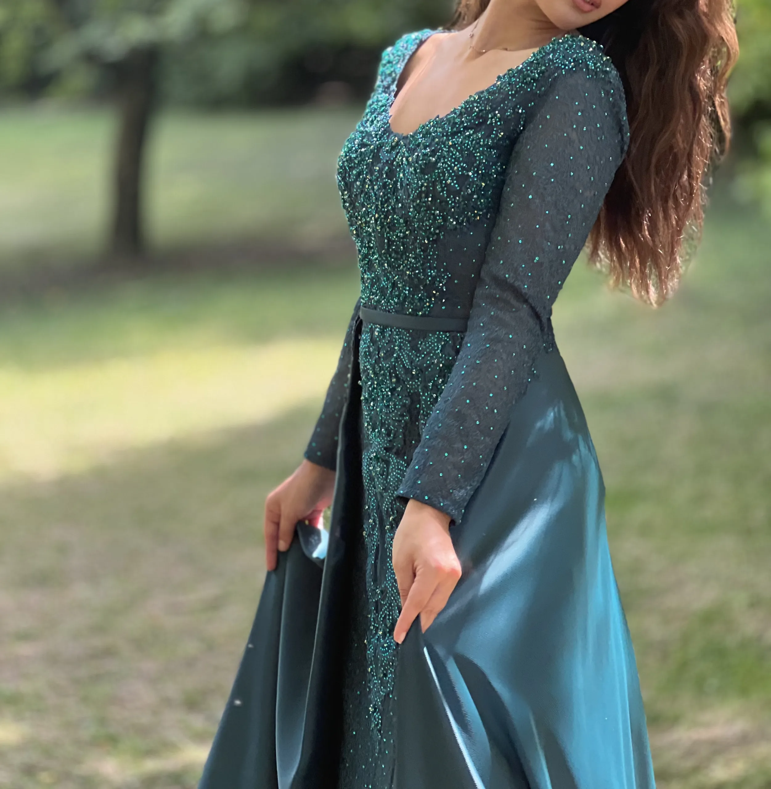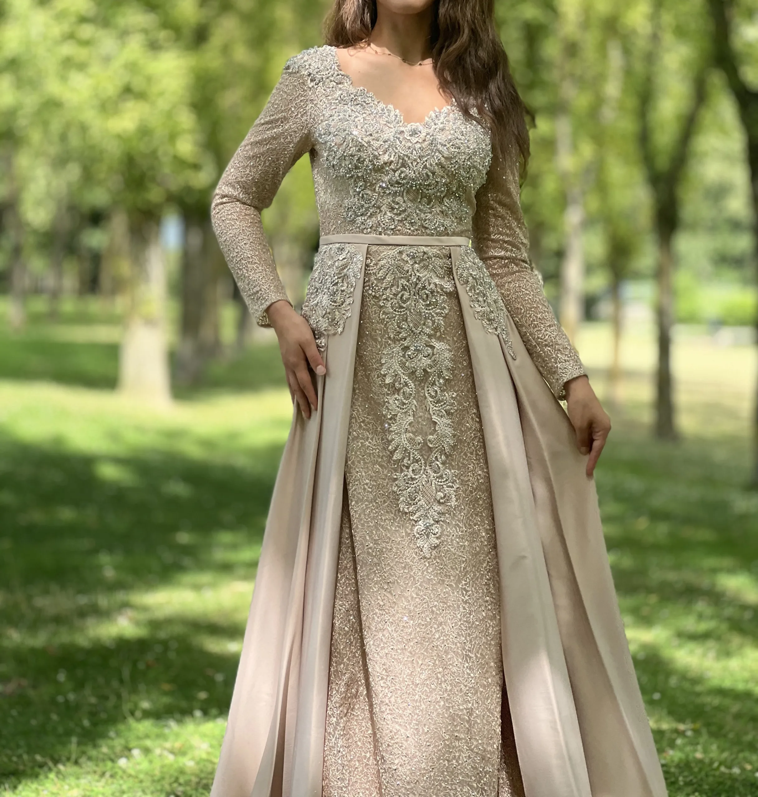Les manches longues de cette robe sont un véritable hommage à l’art de la broderie. Elles sont entièrement travaillées avec de la dentelle perlée, offrant un jeu de lumière exceptionnel à chaque mouvement. Les perles brodées sont disposées avec précision pour créer un éclat raffiné, comme si la robe brillait naturellement sous les lumières d’une soirée prestigieuse. Ce travail artisanal apporte un côté luxe et majestueux à la tenue, parfait pour celles qui souhaitent se démarquer avec élégance.